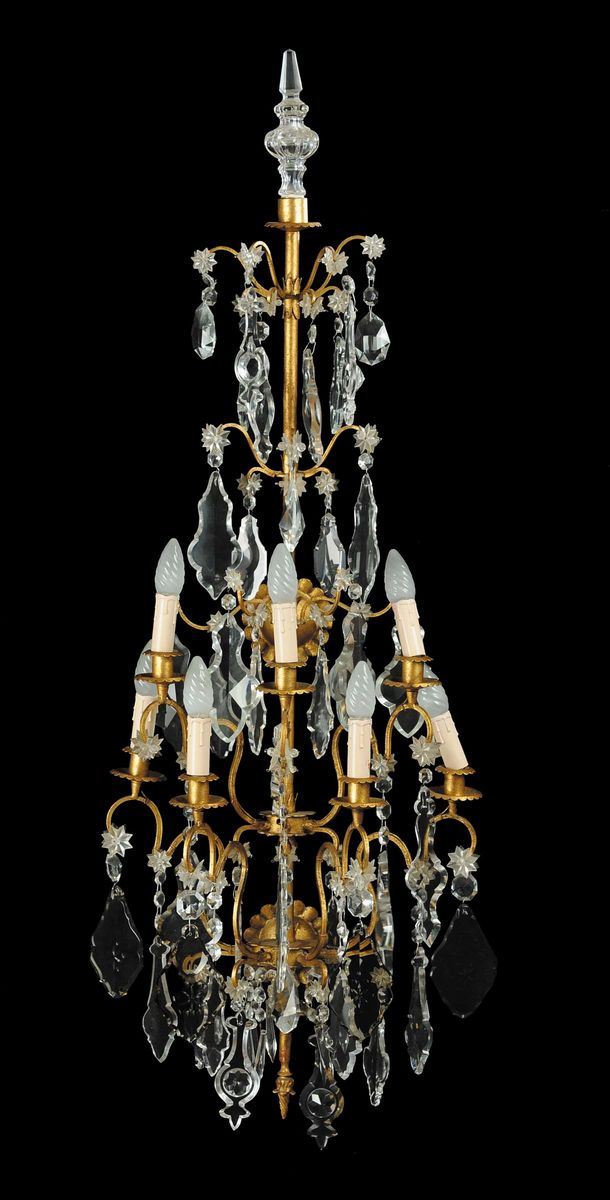 Coppia di appliques a sei luci in metallo dorato e cristallo inciso, XIX secolo