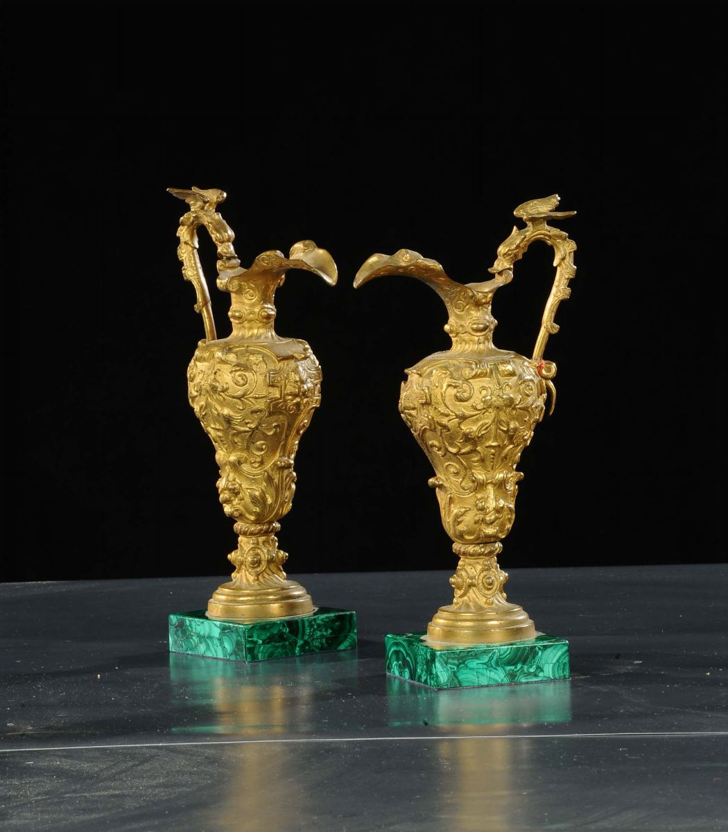 Coppia di brocchette in bronzo dorato con base in malachite, XIX secolo