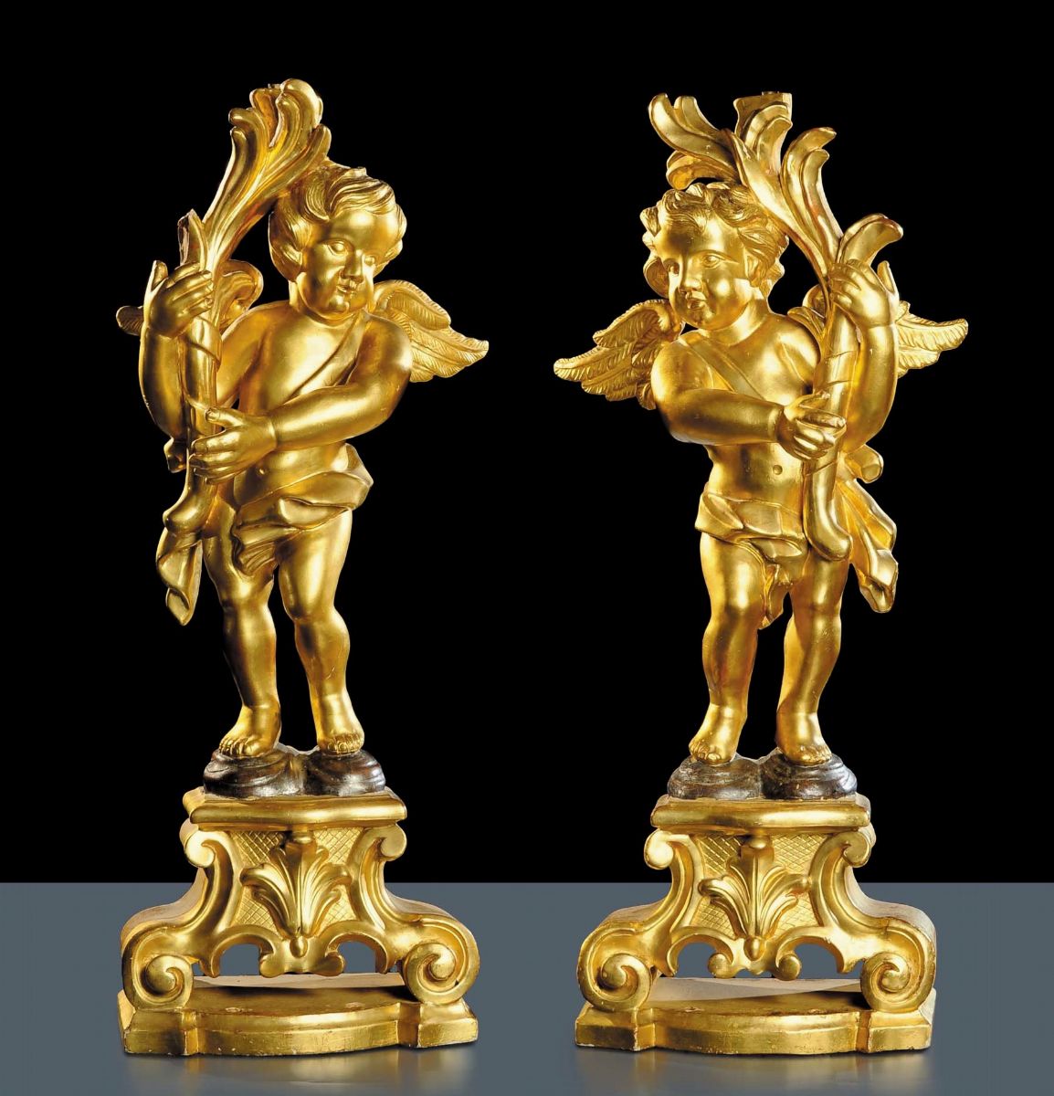 Coppia di putti in legno intagliato e dorato, fine XIX secolo