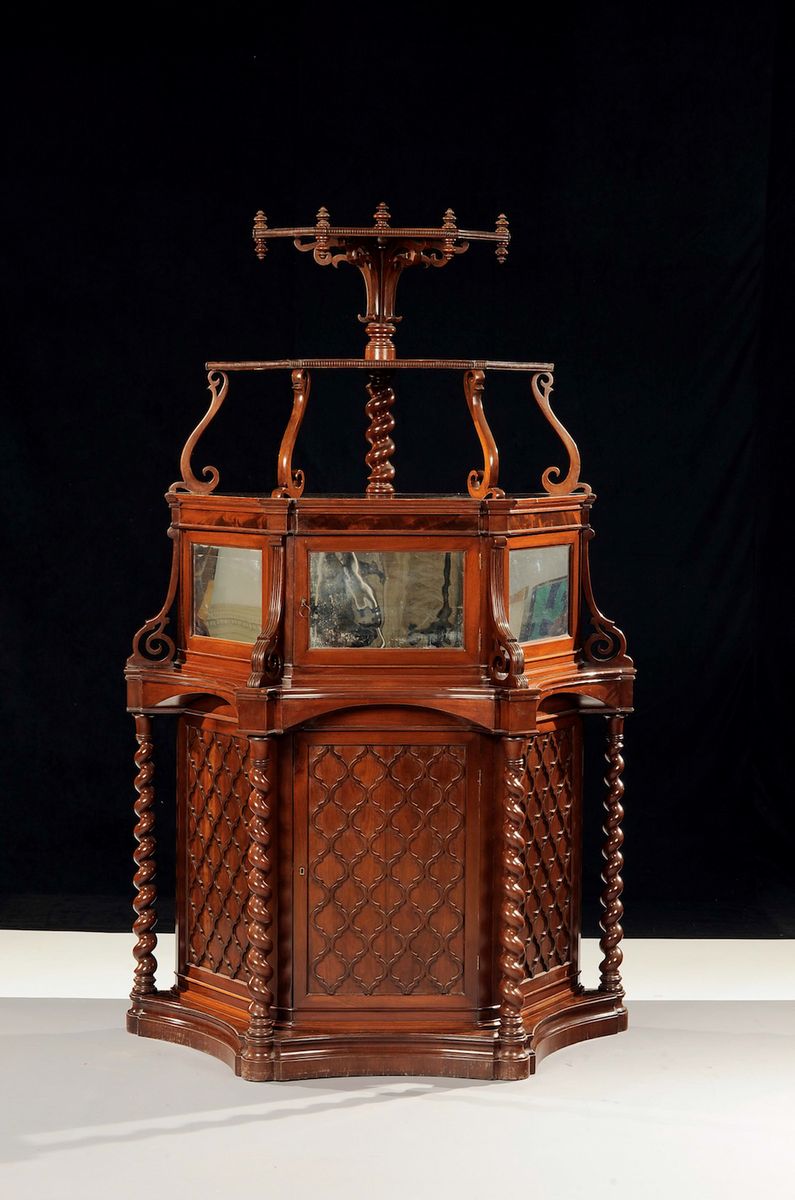 parte superiore a specchio con due alzatine, parte inferiore con sportello centrale e colonnine a torciglione, cm 126x60x200