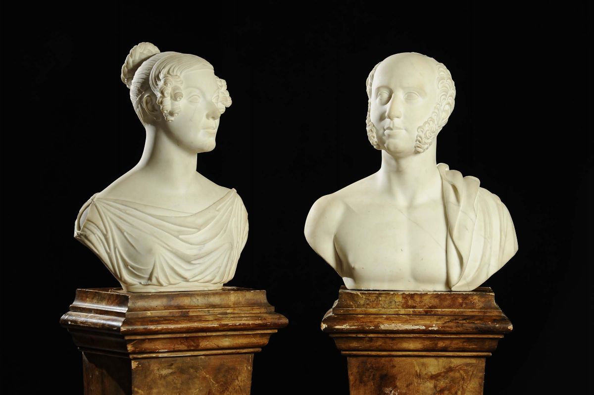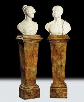 coppia di busti maschile e femminile in marmo statuario, altezza cm 52 e cm 54, poggianti su alte basi troncopiramidali in legno laccato a finto marmo, cm 41x29x115