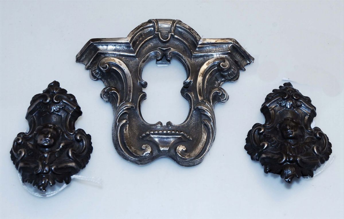 Lotto comprendente coppia di puntali in argento sbalzato con teste di cherubini, XVIII secolo
