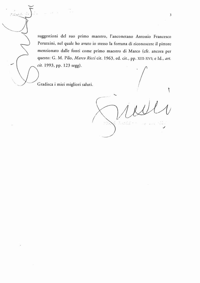 Expertises dei proff. G.M. Pilo e Pietro Zampetti[...] un'opera di notevoli qualitˆ pittoriche, legata alla tradizione veneziana, che sempre aperta e sensibile al mondo della natura [...] Ritengo che questo dipinto sia opera di Marco Ricci, da lui eseguita durante la vivace, anzi turbolenta giovinezza, prima dei documentati e ripetuti soggiorni londinesi [...]