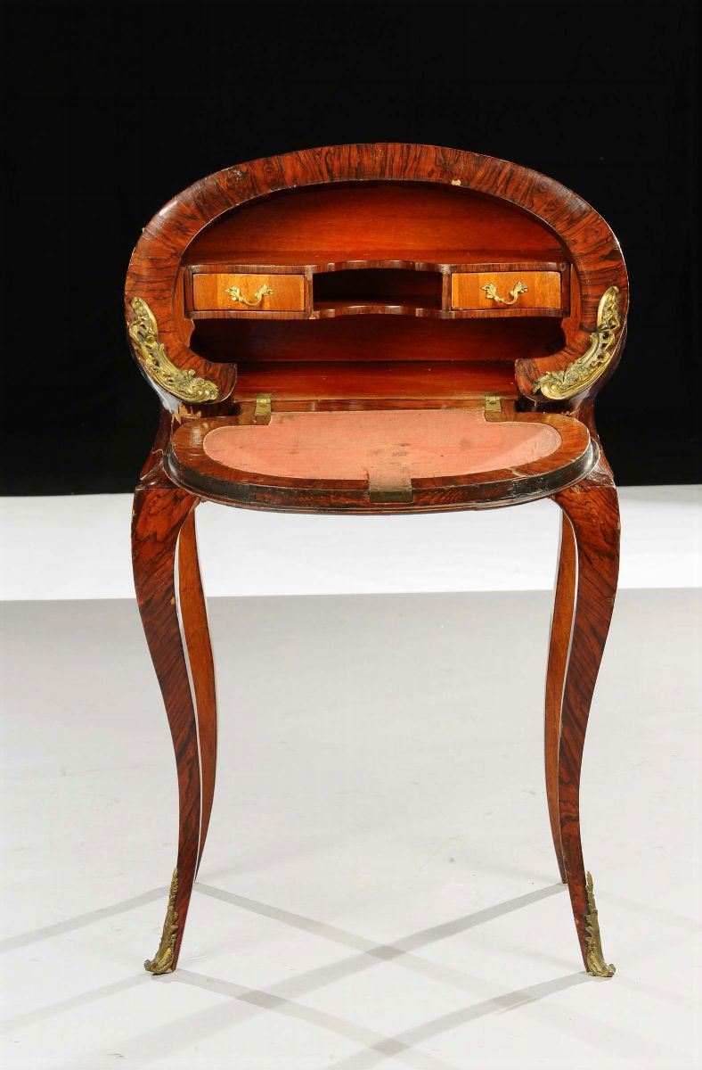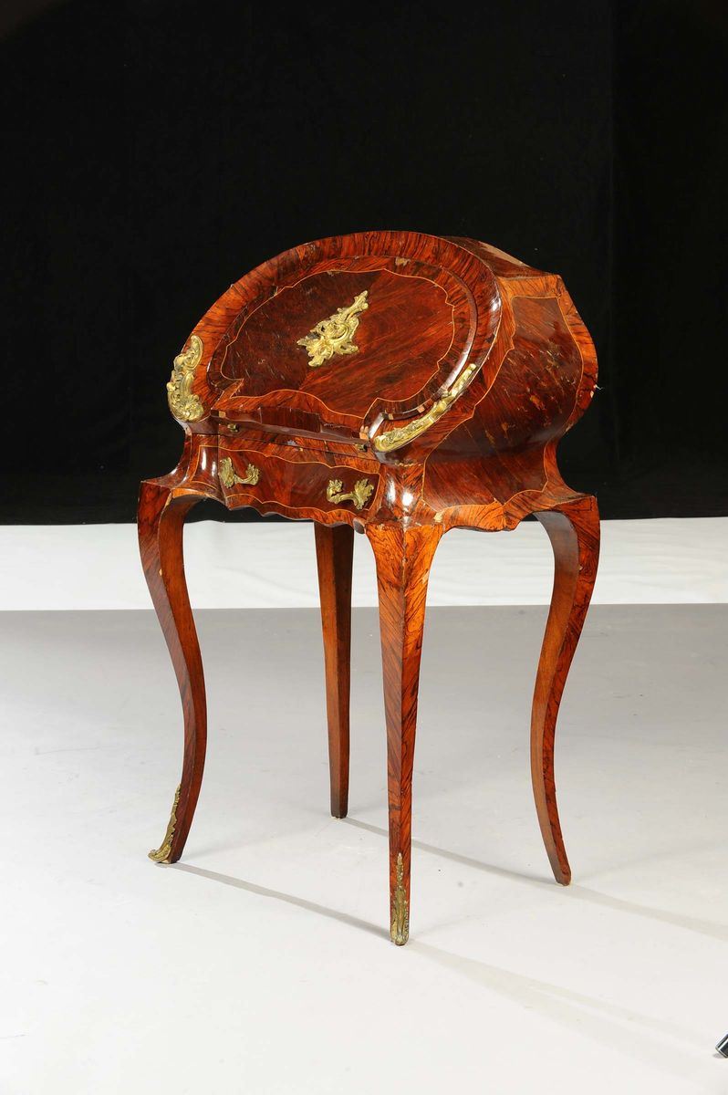 gambe arcuate, un cassettino sotto la calatoia che cela cassettini e vani a giorno, applicazioni di bronzi dorati, cm 65x44x105