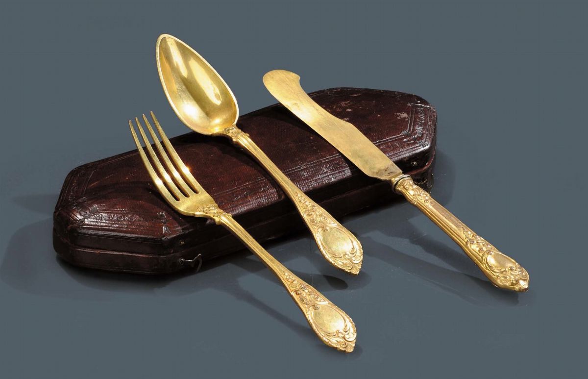 Set di tre posate in metallo dorato e cesellato, Europa XVIII secolo