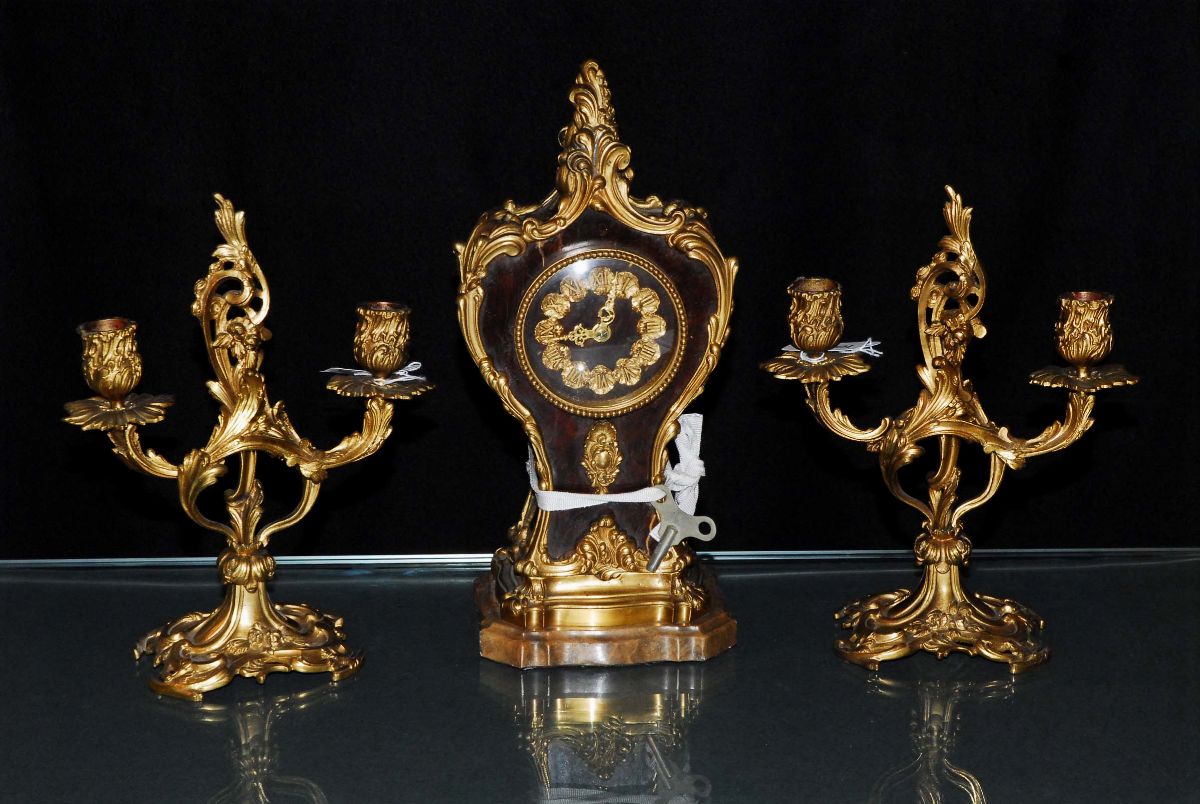 Trittico composto da orologio e due candelieri in legno e bronzo dorato