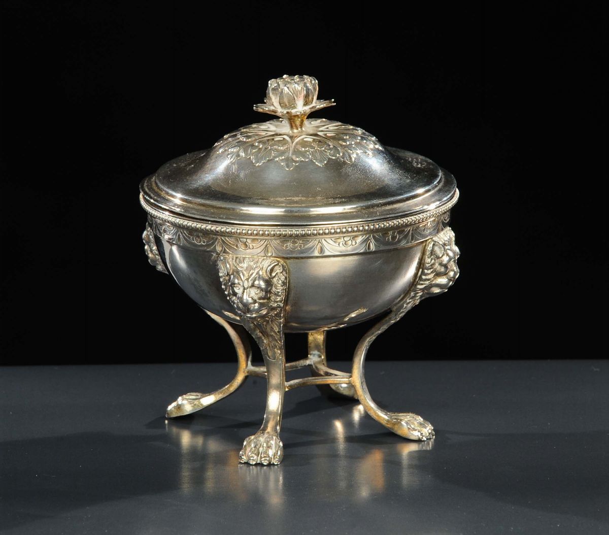 coperchio con presa a fiore, testine di leone sul corpo terminanti con piede ferino, altezza cm 11