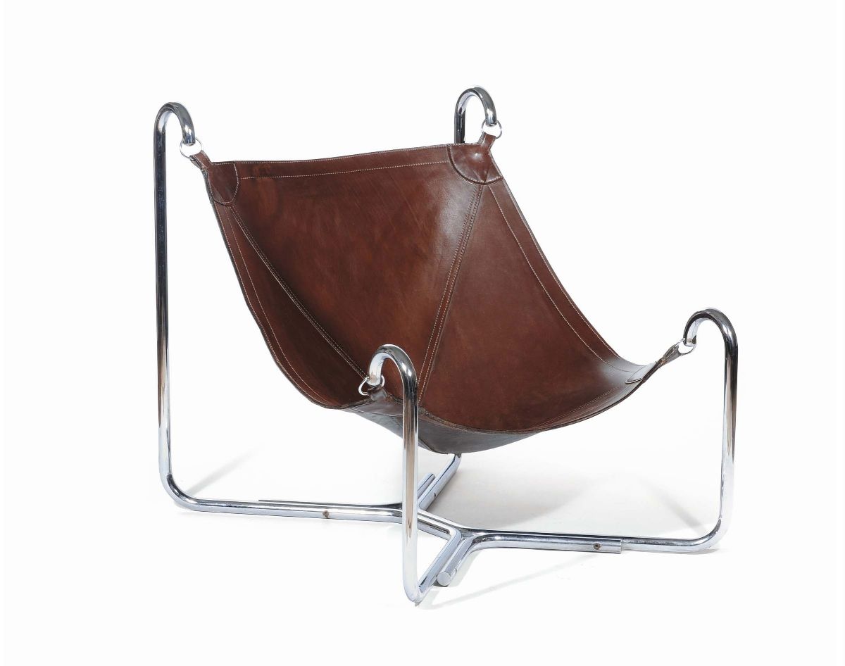 struttura in tubolare e ganci d’acciaio, seduta in cuoio. Leggera scoloritura, cm 87x75 x 98 Bibliografia: A.Pansera e M.Abis, La fabbrica verticale. Il gruppo industriale Busnelli, Electa, Milano 1998, pagg. 42, 134.