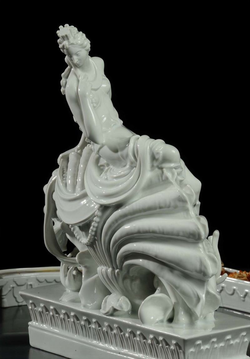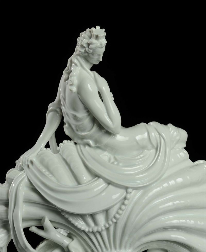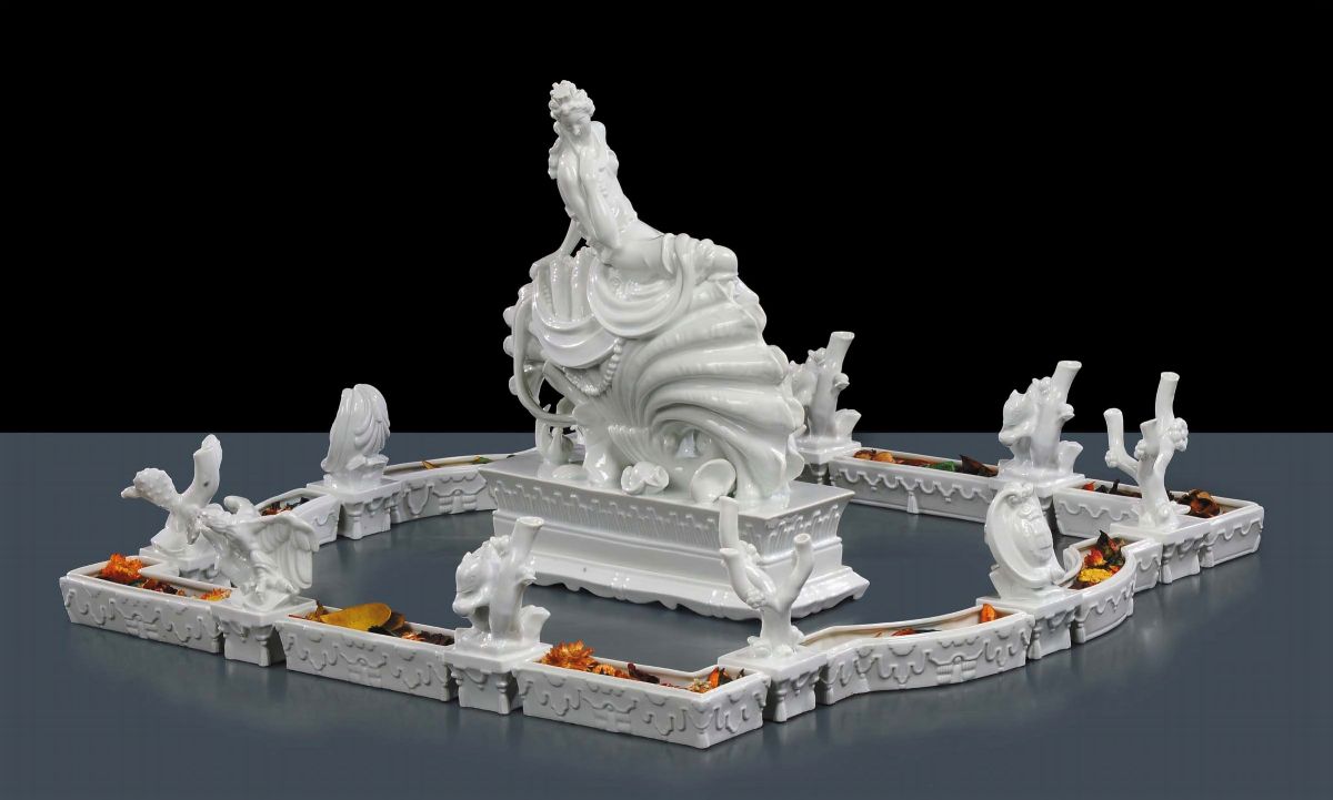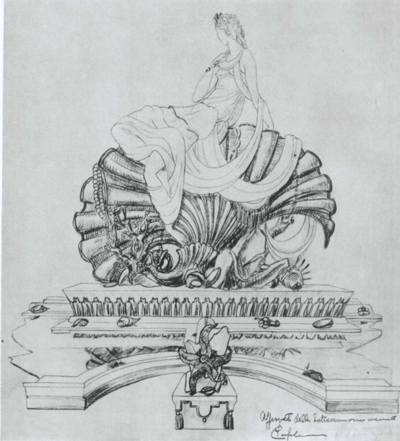 Composizione in porcellana composta da gruppo centrale e venti elementi complementari, tra cui vaschette per fiori, scoiattoli, rami di corallo e stemmi sabaudi. Ideata per le Ambasciate Italiane, fu prodotta in serie llimitata nel 1926-1927.Disegni di Gio Ponti e Tommaso Buzzi, realizzazione plastica di Italo Griselli. Sotto la base di un elemento: Ginori