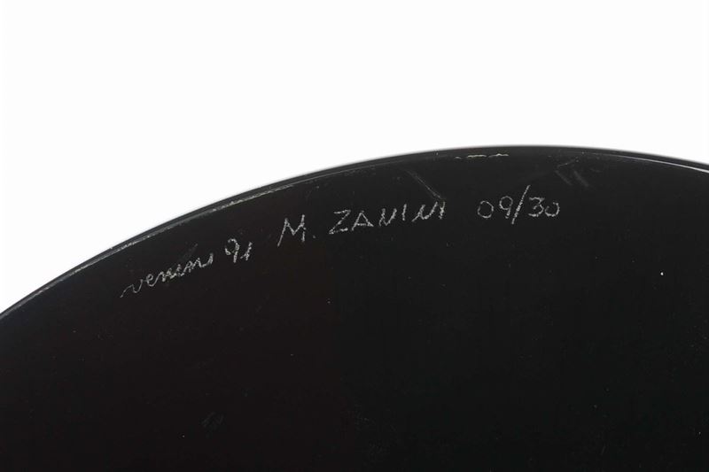 Composto da vaso esterno con striscie diagonali in vetro lattimo e vaso interno con striscie verticali in vetro azzurro. Prod. 1991, esemplare 9 di 30, altezza cm 32