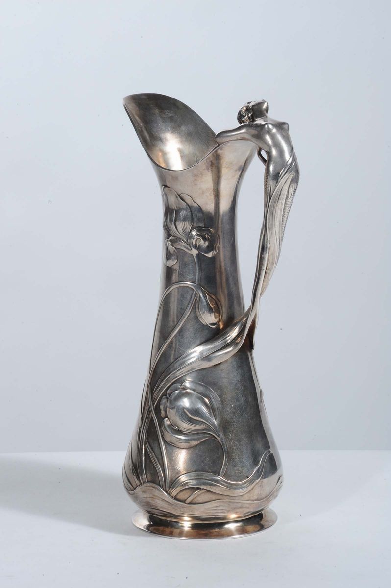 Metallo argentato con fiori in rilievo e manico a guisa di sirena. Marchio della manifattura sotto la base, 1900-1906, altezza cm 37.Cfr. Art Nouveau Domestic Metalwork, Antique Collector Club, pag. 138, fig. no. 138