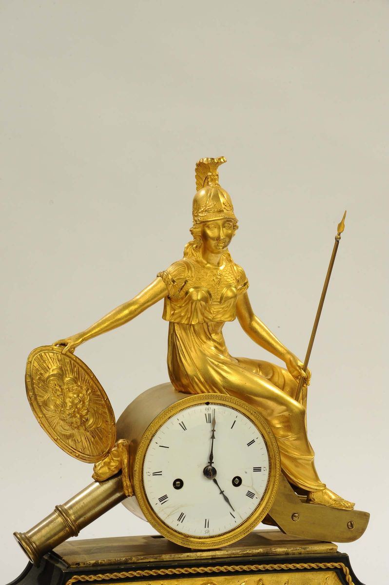 bronzo dorato e patinato nero. La Dea è assisa su un fusti cannone con la bocca rivolta verso il basso come segno di pace. Base sorretat da piedi zoomorfi e ornata con ricca piastra a rilievo dove amorini illuminano con torce trofei di guerra. Movimento con scappamento ad ancora e sospensione a filo, suoneria ore/mezze al passaggio su campanello. Bronzo attr. a Pierre Philipp Thomire, cm 45x30x9 (parti non coeve)