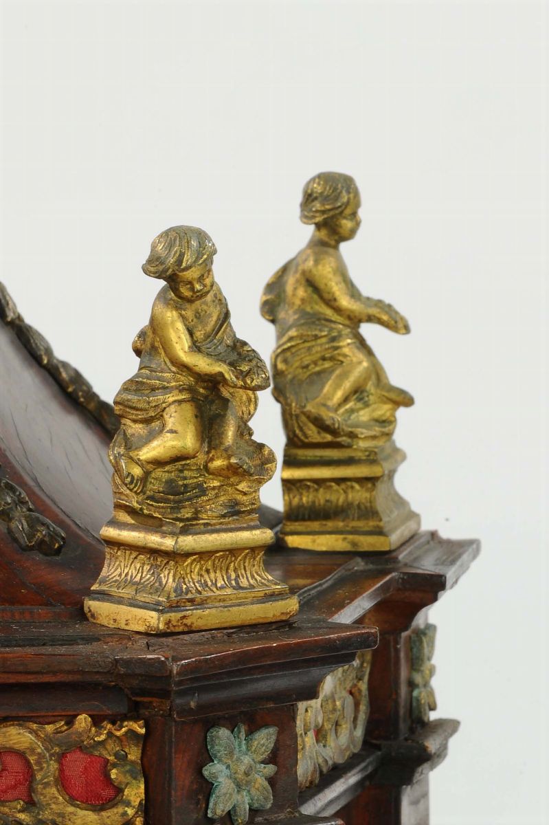 cassa lastronata in palissandro con ricche applicazioni di bronzi dorati, sormontata da quattro figure raffiguranti le quattro stagioni e maniglia con figura di leone, quadrante dorato con fascia oraria incisa, lancette in ferro a fantasia, quadrantino ausiliario per la sveglia, meccanica con scappamento a verga, suoneria a ore e quarti al passaggio, carica a un giorno, cm 40x18x55