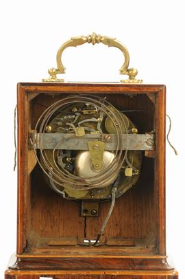 movimento a scappamento a cilindro, gran suoneria al passaggio ed al richiamo su doppio gong, sveglia a carica separata, sul fronte leva per la selezione gran e piccola suoneria e silenzio, cm 21,5x16,5x12,5