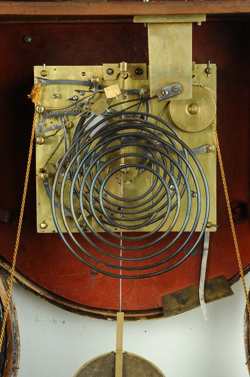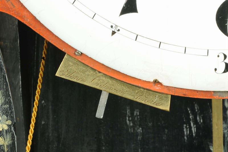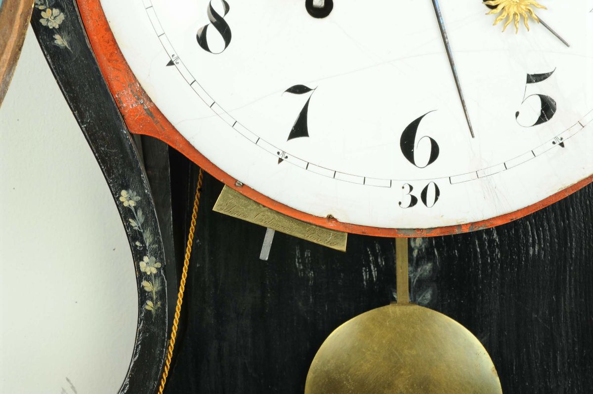 decori floreali azzurri, lumeggiature in foglia d’oro, quadrante smaltato con numeri arabi, lancette in acciaio a soleil, movimento con scappamento ad ancora, suoneria ore/mezze su gong al passaggio e al richiamo, sveglia con lancetta centrale, leva di selezione per piccola e gran suoneria e silenzio, altezza cm 80