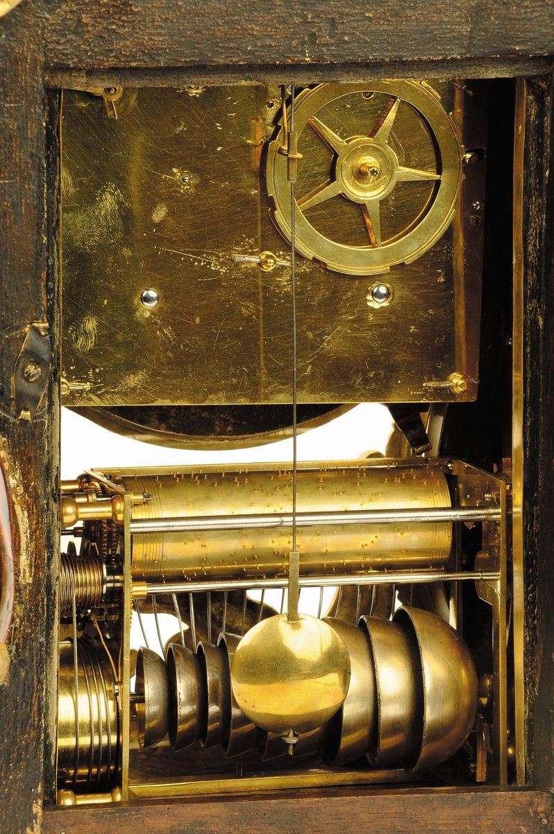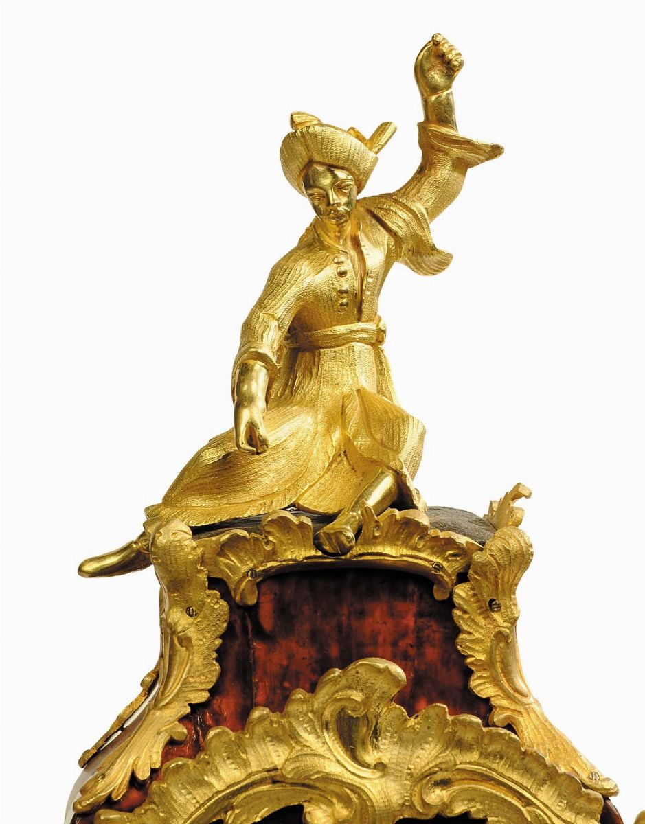 cassa dal profilo sagomato con ricche applicazioni di bronzi dorati sormontata da figura maschile alla sommità. Quadrante smaltato con numeri romani e arabi, scappamento a verga, suoneria ore e mezze a passaggio. Prima della suoneria delle ore suona melodia su 9 campanelli per un totale di 8 melodie con spostamento automatico, cm 58x28x13, console cm 24x33x18 (elementi non coevi, restauri e sostituzioni)