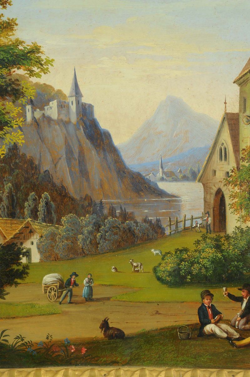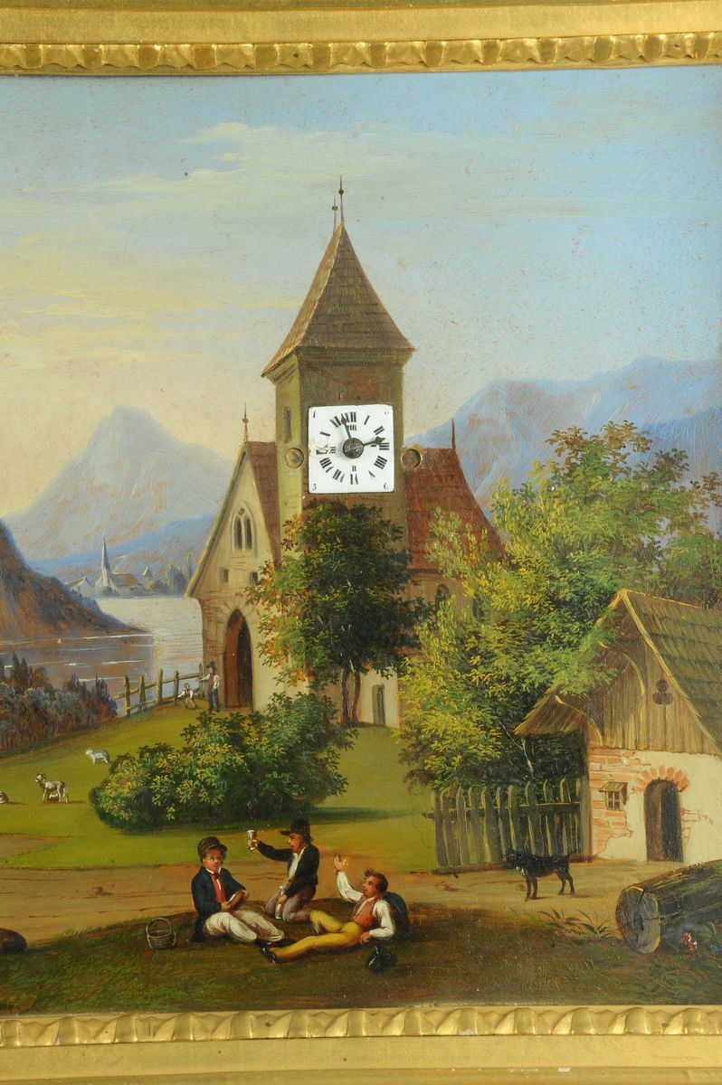 Orologio a quadro raffigurante paesaggio ad olio su rame con veduta di montagna, Austria XIX secolo