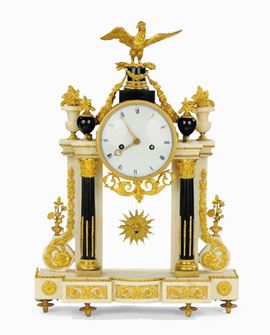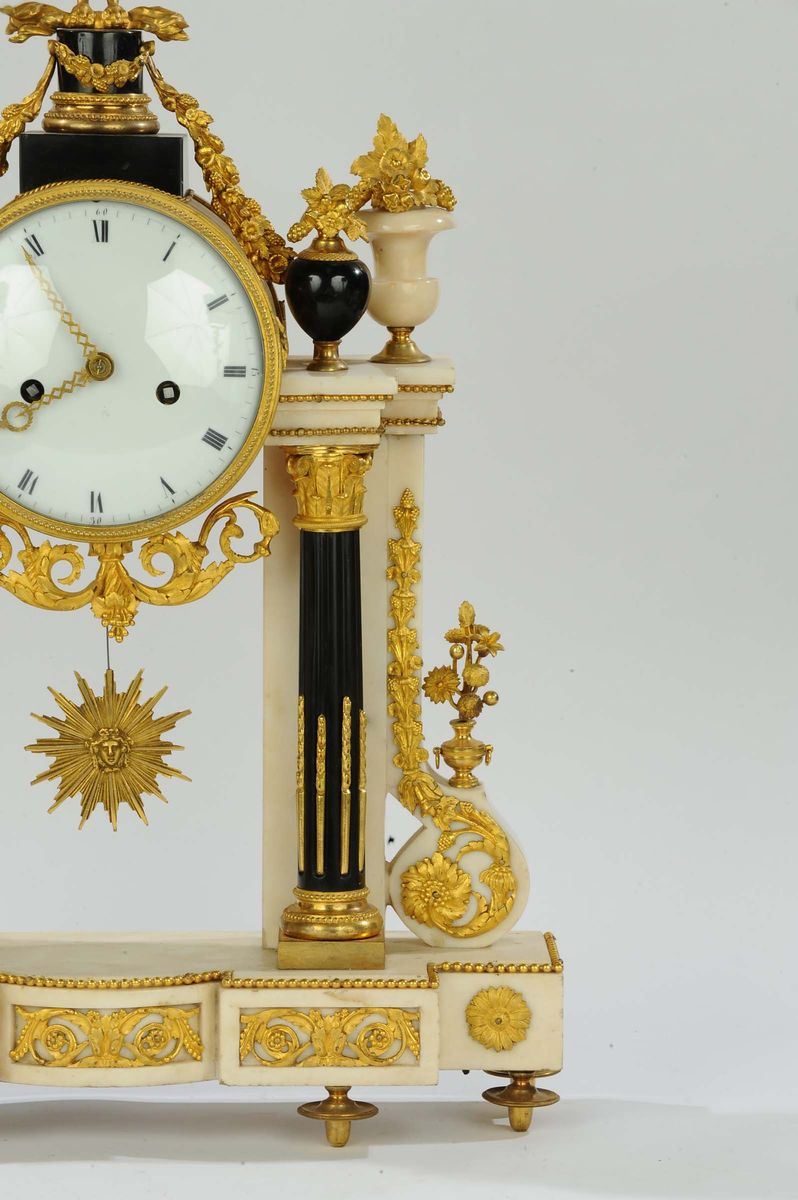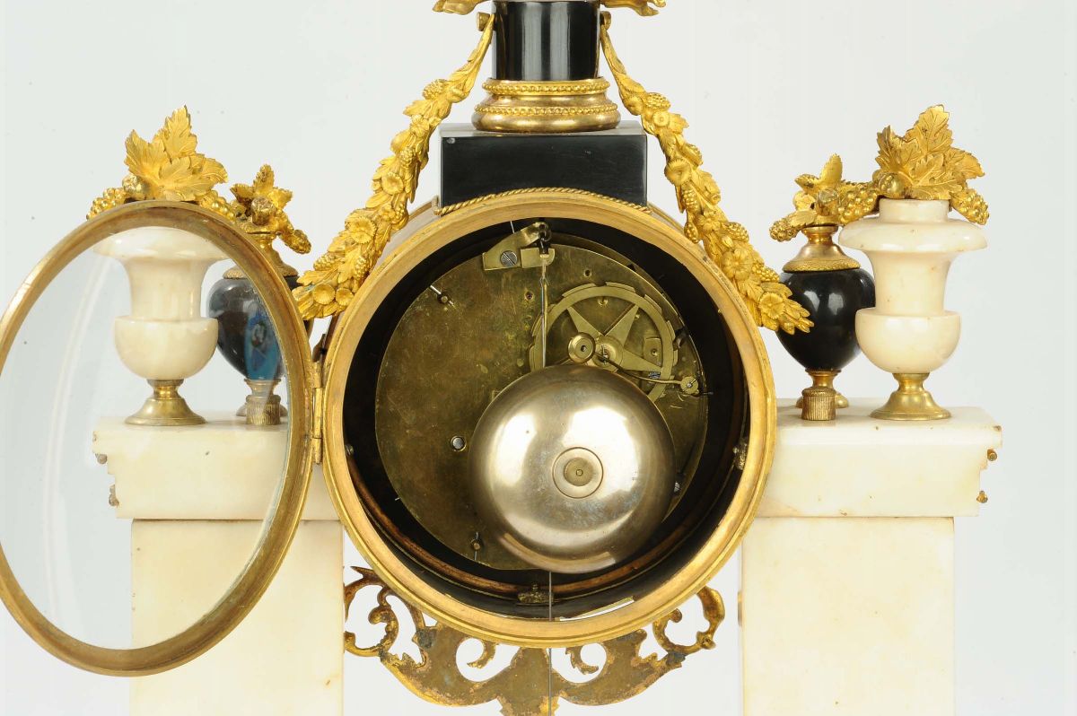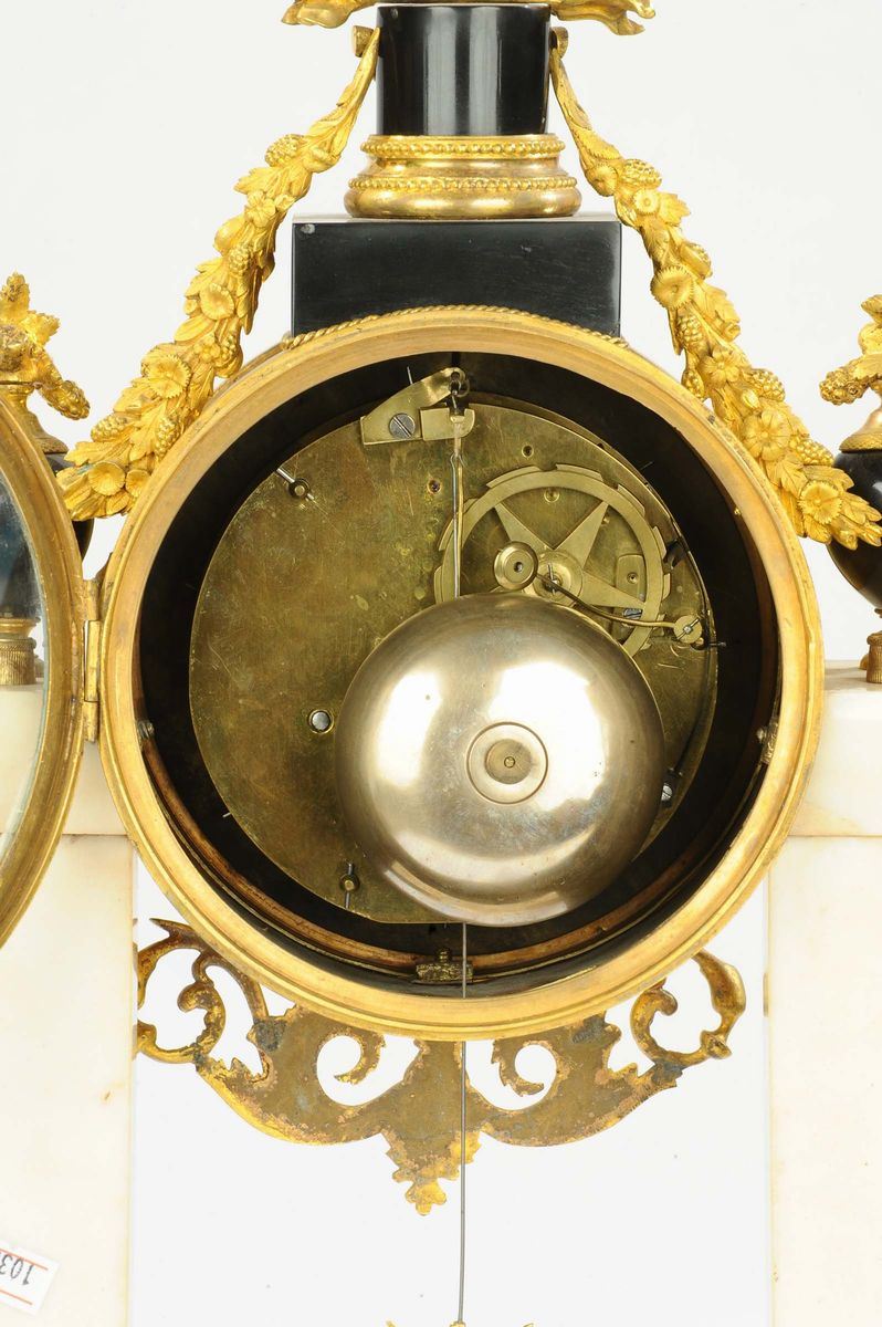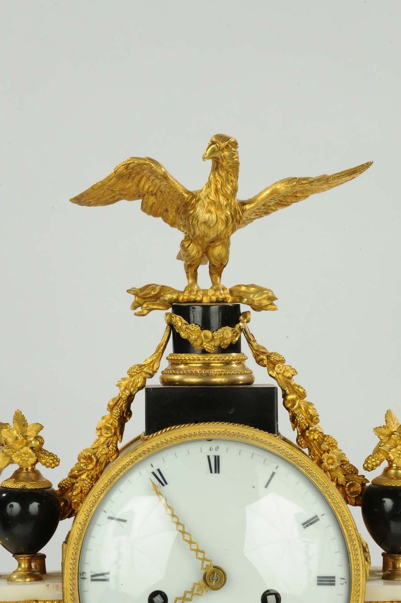 Orologio a tempietto in marmo bianco e nero arricchito con fregi in bronzo dorato e aquila sulla sommità, XVIII-XIX secol [..]