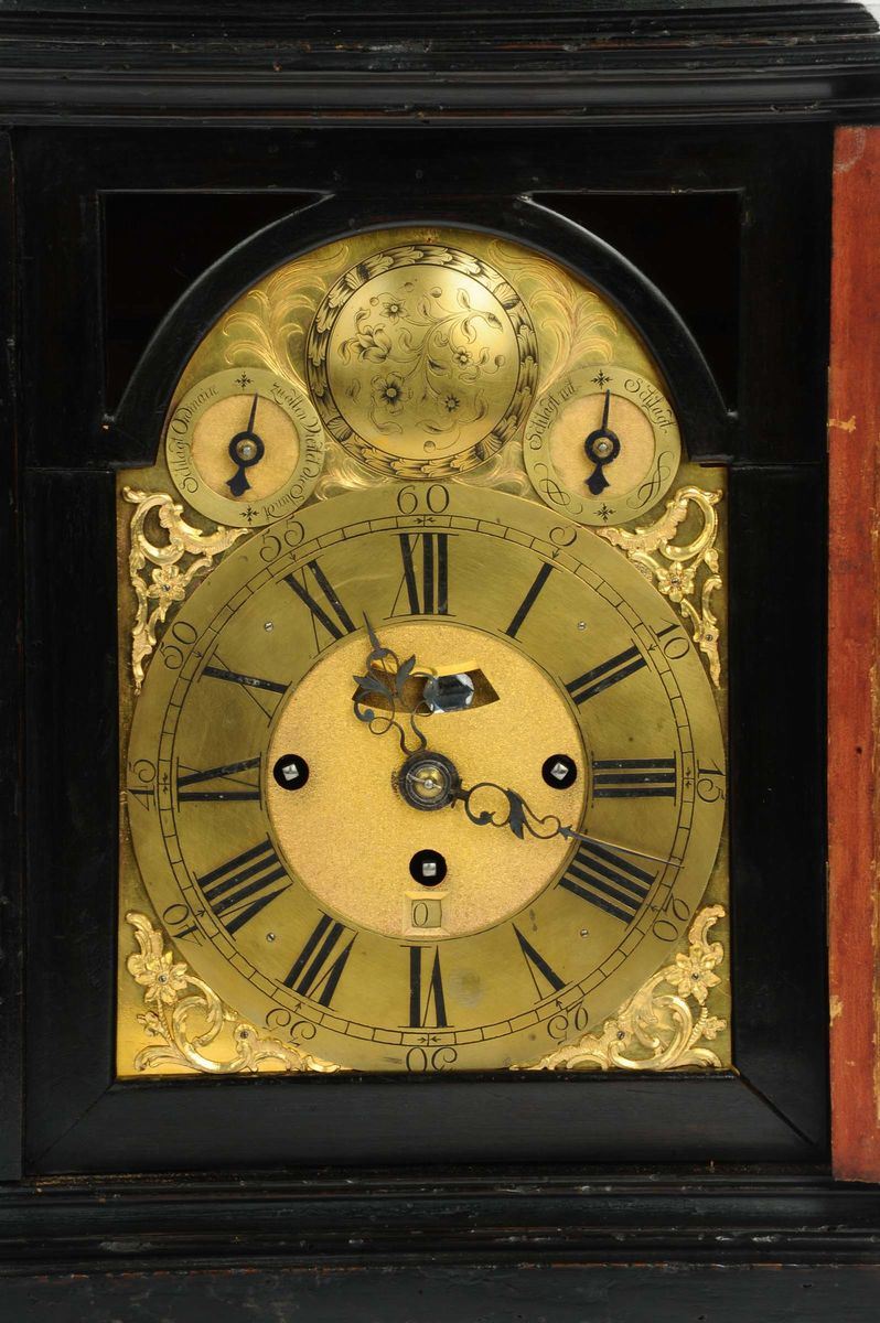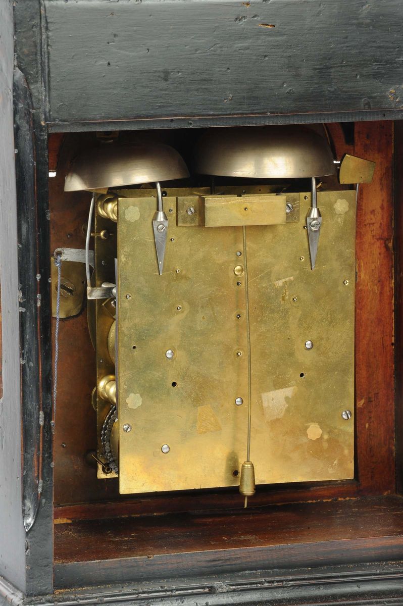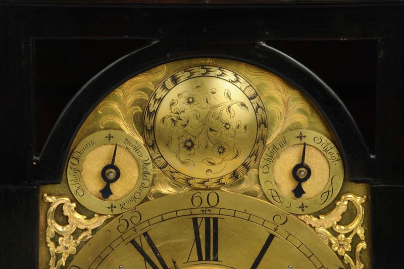 cassa in legno ebanizzato, quadrante in bronzo dorato, falso pendolo e data, scappamento a verga, suoneria ore e quarti, gran suoneria a passaggio e richiesta, cm 50x31x18