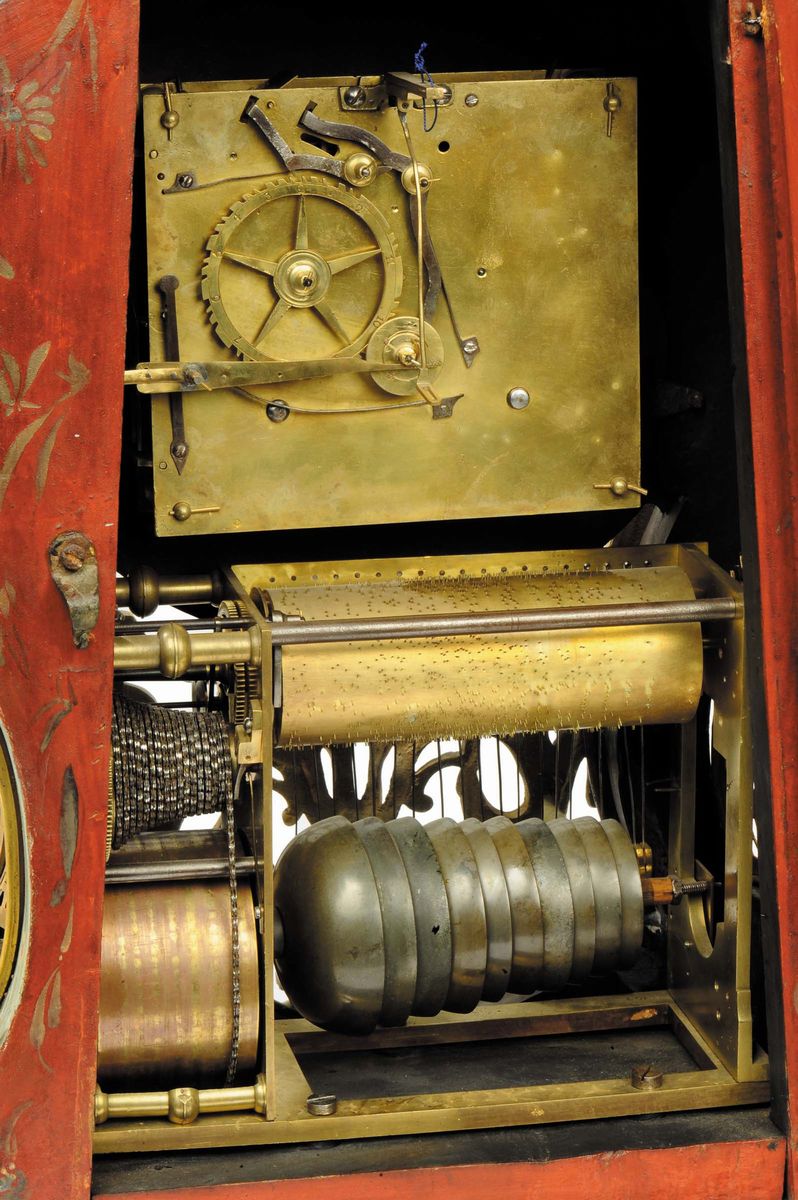cassa dalle forme curvilinee in legno laccato con decorazione floreale policroma su fondo verde/azzurro e applicazioni di fregi in bronzo dorato a motivi vegetali e sorretta da quattro zampe in bronzo a foglie d’acanto. Il cappello, abbellito dalle stesse decorazioni della cassa, presenta sulla sommità un vasetto biansato in bronzo. Il quadrante smaltato ha una numerazione romana per le ore e araba per i minuti, con due lancette a fantasia in ferro dorato poste a indicare il tempo. Meccanica svizzera a due treni con scappamento a verga e sospensione a filo; suoneria a ore e quarti al passaggio su campanelli con carillon per le ore a 18 martelli, meccanismo del carillon a conoide, cm 40x18x80 (mancano un paio di campanelli)