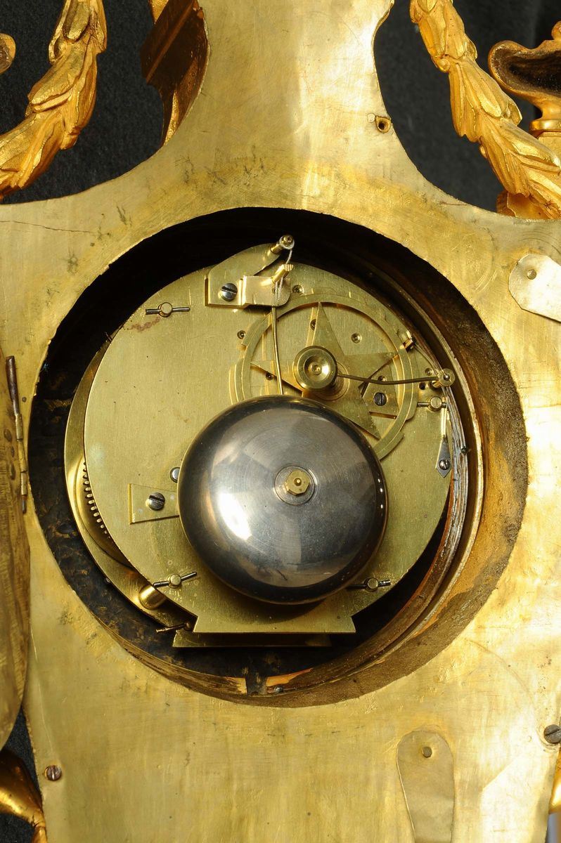 cassa in bronzo dorato e cesellato decorata con festoni e vasi, quadrante in smalto dipinto con numeri romani e arabi, lancette traforate a fantasia in metallo dorato, scappamento ad ancora con sospensione a filo di seta, suoneria ore/mezze al passaggio su campanello, altezza cm 61
