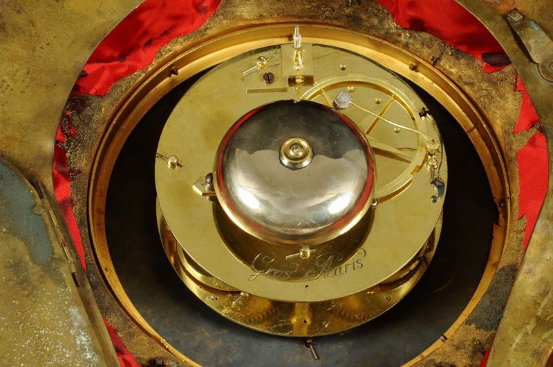 cassa in bronzo dorato al mercurio, quadrante smaltato con numeri romani e arabi, lancette in ottone dorato e traforato Luigi XVI, movimento firmato detto Parigi sviluppato su due treni di ruote, scappamento ad ancora, sospensione a filo di seta, suoneria ore e mezze a passaggio, cm 80x41x15 (quadrante restaurato)