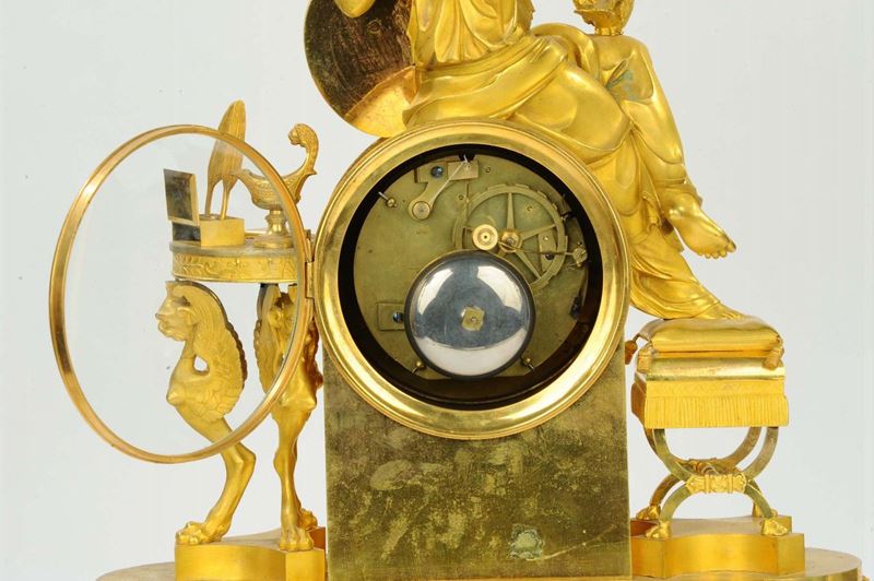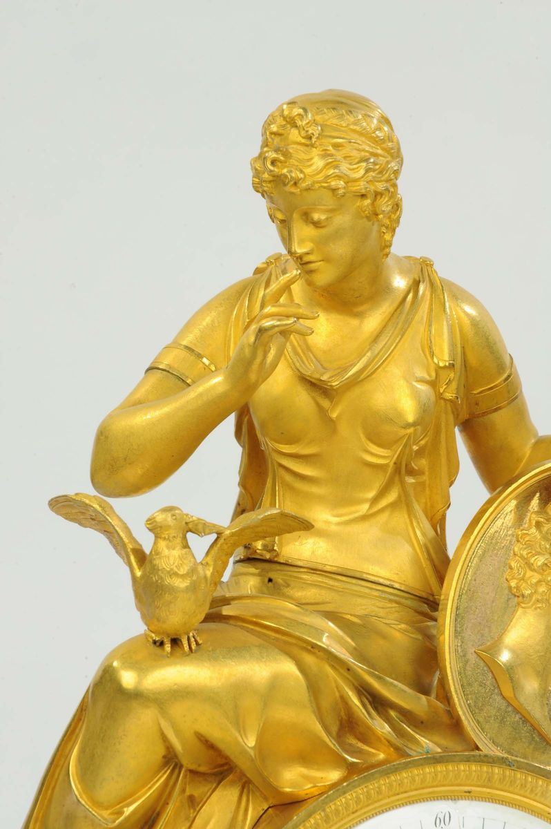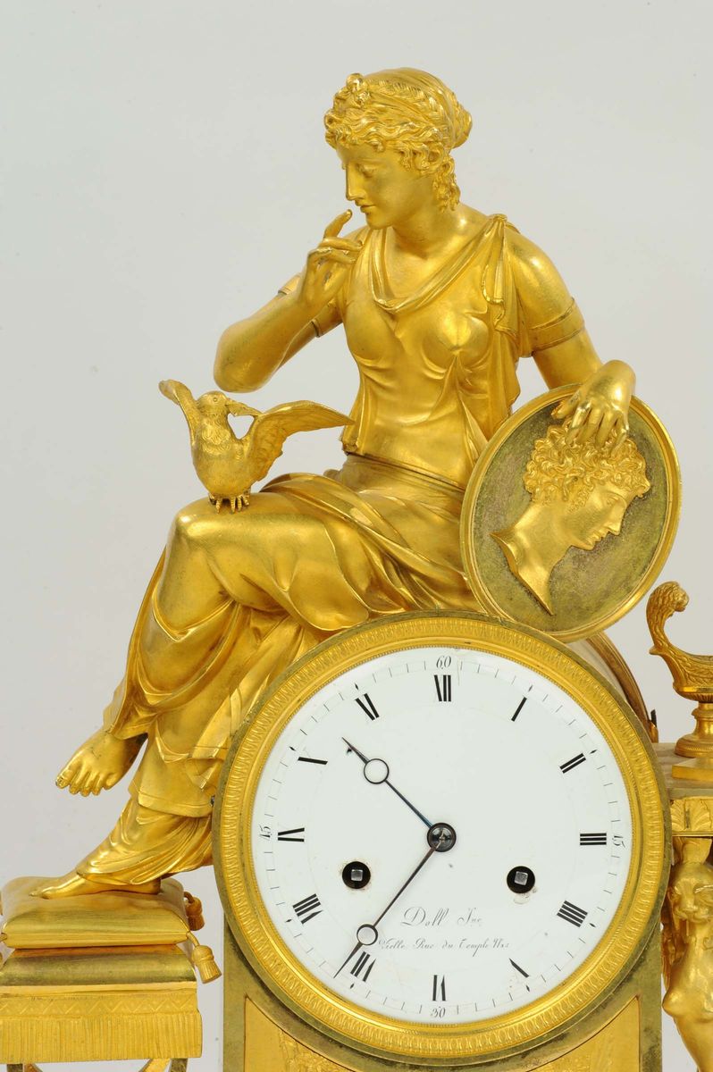 movimento con scappamento ad ancora, sospensione a filo di seta, suoneria delle ore e mezze al passaggio, cm 40x16x50Quest’orologio fu realizzato per la parte scultorea da Franÿois-Louis Savart verso il 1810; un suo disegno (Parigi, Bibliothèque Nationale, Cabinet d’Estampes, pubblicato da Ottomeyer – Pröschel, 1, p. 376) mostra una fanciulla che sta pensando al suo innamorato, ritratto nel grande medaglione posato accanto a lei. Sulle ginocchia sta la colomba: la colomba porterà la missiva amorosa all’innamorato (lo si vede nella scena inferiore sotto l’ orologio), ma lo sguardo della colomba che incontra quello della fanciulla e il gesto della mano di lei con l’indice alzato, simboleggiante attenzione, spostano al campo del pensiero l’intento amoroso, come se la fanciulla provasse nostalgia per la mancanza dell’ innamorato. Elegantissime suppellettili fanno da contorno alla scena: uno sgabello con gambe ad X come la sedia curule romana, una athenienne con un servizio da scrittura. L’immagine bucolica del giovane pastore che riceve la missiva dal piccione, è rafforzata dalla presenza di due pecore sulla base dell’orologio; anche il giovane è trasognato, ha appena smesso di suonare il flauto
