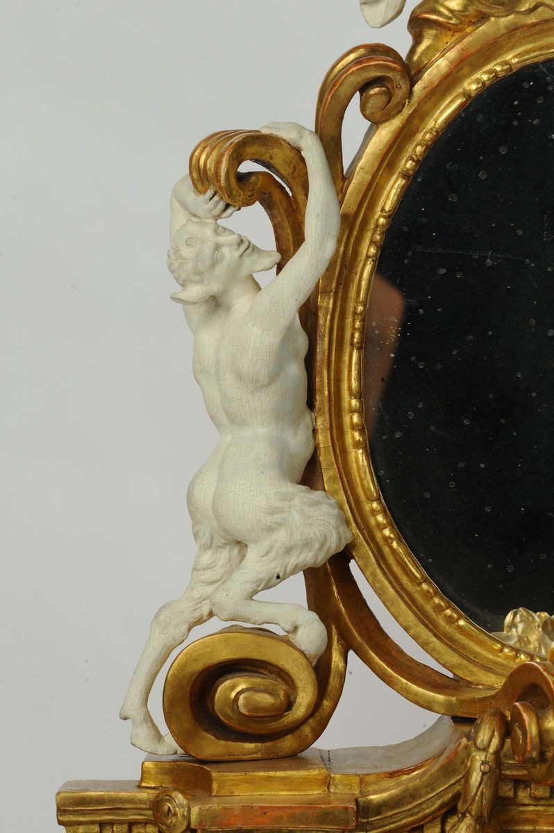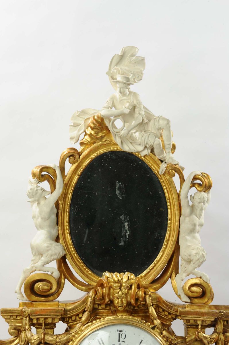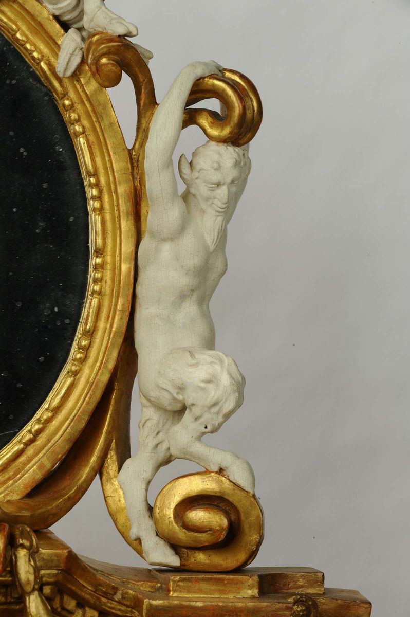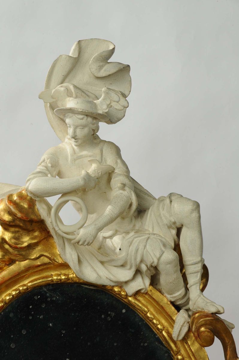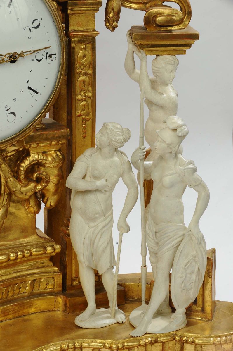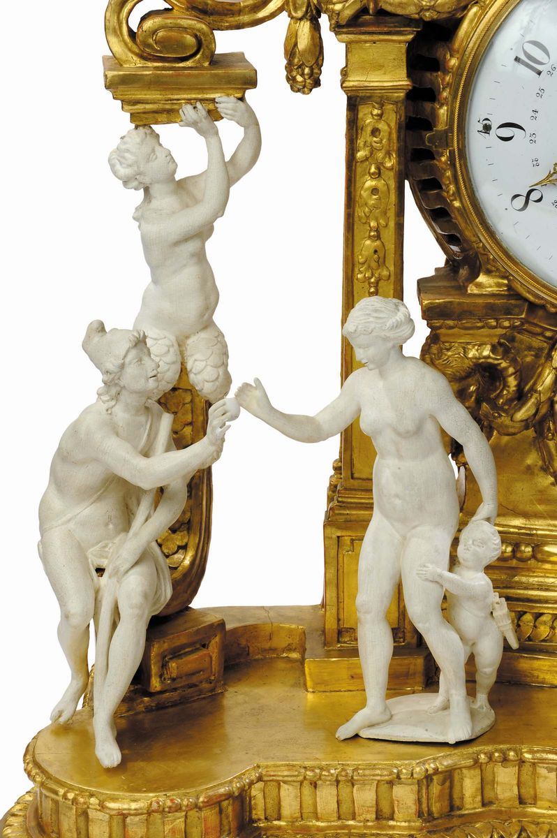 cm 70x25x104Questo inedito, imponente e sontuoso orologio, strutturato in forte verticale, quasi a simbolizzare il monte Ida, scenario del mito, è realizzato in legno dorato, mentre le statue intagliate in legno sono laccate. Il grande quadrante, con la pendola a vista, è inserito in un’architettura a forma di portale barocco, vagamente borrominiano, ornato di festoni e le cui arcate esterne sono sostenute da due sirene terminanti in zampe di rettile; sul timpano si erge un alto fastigio in cui è inserito uno specchio ovale sostenuto da due fauni; in cima allo specchio è seduto Mercurio in una curiosa veste contaminata dalla immagine della Fama; ha infatti i tipici calzari e l’elmo alato, ma in mano regge, al posto della tradizionale tromba della Fama, un corno in attesa di propagare la notizia della vittoria. Il dio guarda in basso verso la scena del giudizio che si svolge su un solo piano, come su un proscenio. La distribuzione dei personaggi nello spazio è improntata fortemente alla scenografia del teatro classico del sei-settecento: la nobile architettura barocca dell’ orologio è lo sfondo contro il quale i personaggi dell’ azione sono distribuiti con ricercata equilibrio, due per parte. A destra si vedono Minerva con scudo, lancia ed elmo piumato e Giunone, si sostiene ad uno scettro, come ad un bastone, e si tocca il petto nel tipico gesto dell’ umiltà. A sinistra Paride, vestito da pastore frigio con in capo il tipico berretto, sta già offrendo il pomo a Venere; la dea è secondo la classica iconografia completamente nuda e si appoggia ad Amore. Questa composizione dal gusto molto magniloquente e che aspira chiaramente alla grandeur dell’orologio da salone, oltre ad avere connotazioni colte (la contaminazione fra diverse divinità nel caso di Mercurio-Fama) denotanti uno studio iconografico progettuale, rivela il desiderio di creare una immagine di tipo classicheggiante, grazie alla specularità delle figure che sono determinate solo dalle diverse posture. Certamente per la stessa ragione di simmetria è stato scelto il numero pari dei personaggi.