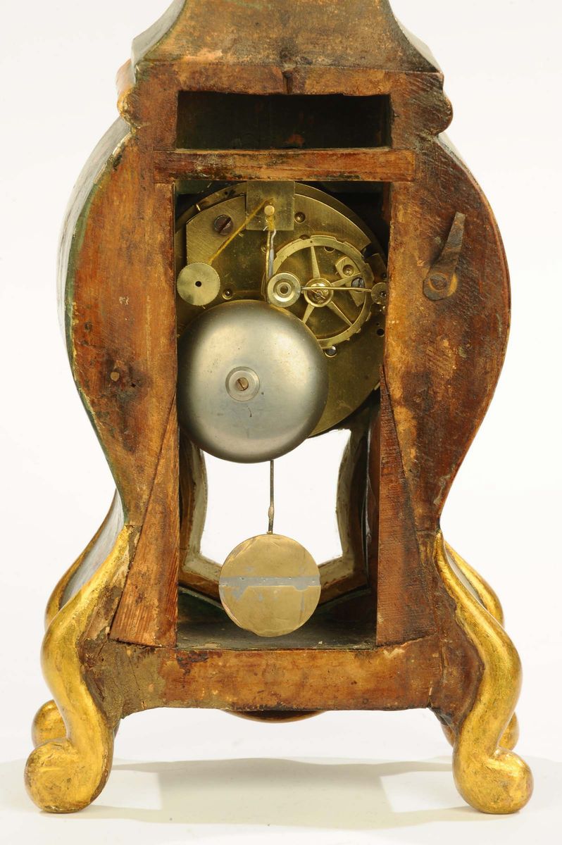 cassa laccata in verde con decori floreali, meccanica francese con movimento a filo, suoneria ore/mezze su campanello, altezza cm 30 (meccanica non pertinente e non funzionante)