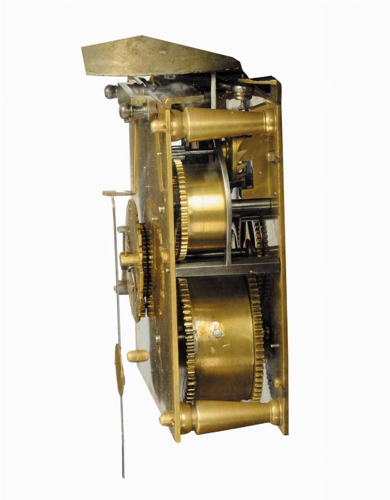 ampio quadrante di bronzo dorato con quattro fregi laterali, con cerchio delle ore argentato con numeri romani incisi. Maniglia e piedini cesellati e dorati. Un foro di carica per tempo e suoneria. Un foro per la sveglia e la suoneria di ore e quarti, piccolo disco al centro per la sveglia, scappamento a verga, cm 40x27x57