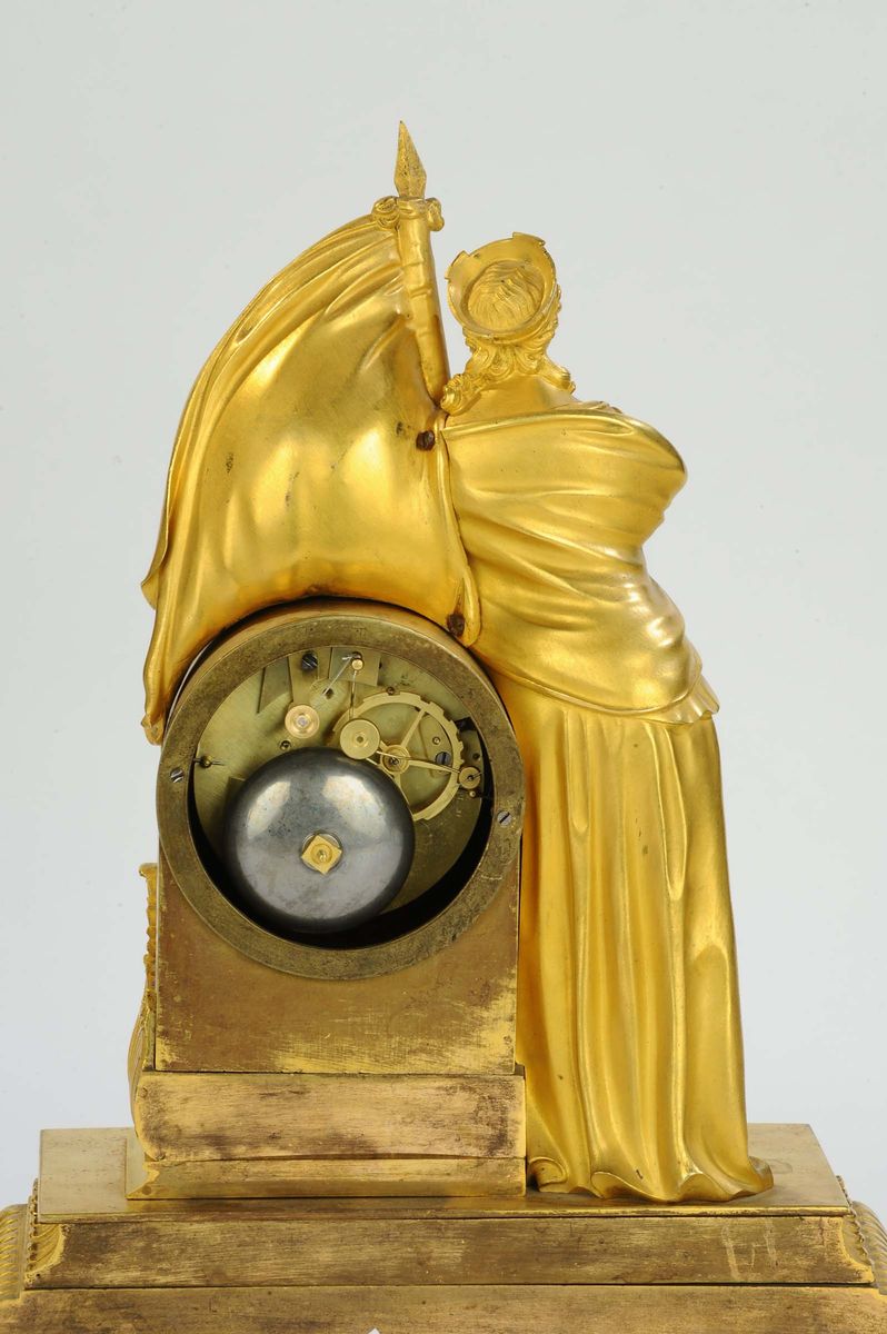 la rappresentazione è nell'allegoria dell'Italia turrita che regge una lancia alla cui estremità vi è legata una bandiera sotto al quale un gallo, simbolo della rinascita, spiega le ali. Cassa e base sono arricchite da elaborati disegni e motivi floreali e foglie d'acanto. Quadrante in metallo dorato con incise le ore in numeri romani e la suddivisione della minuteria, mentre due lancette Breguet indicano le ore. Meccanica a scappamento ad ancora con sospensione a filo e registro a tergo; suoneria a ore e mezze al passaggio su campanello, carica settimanale, cm 27x11x37