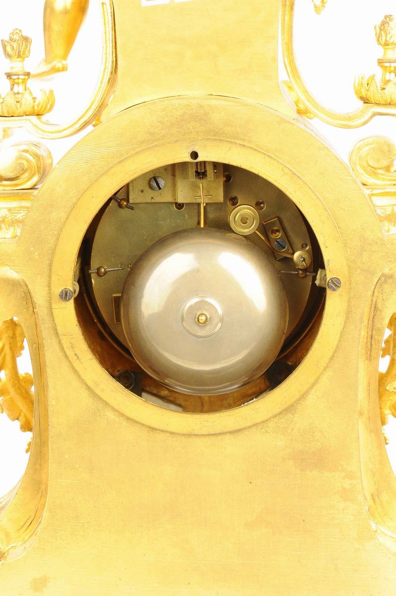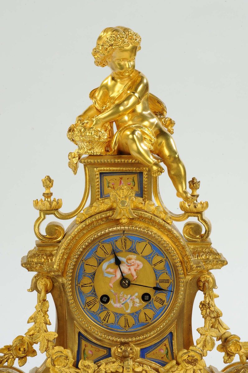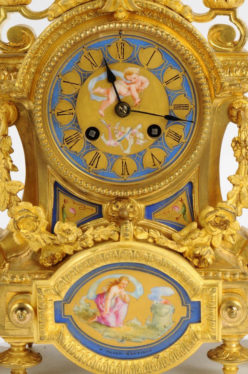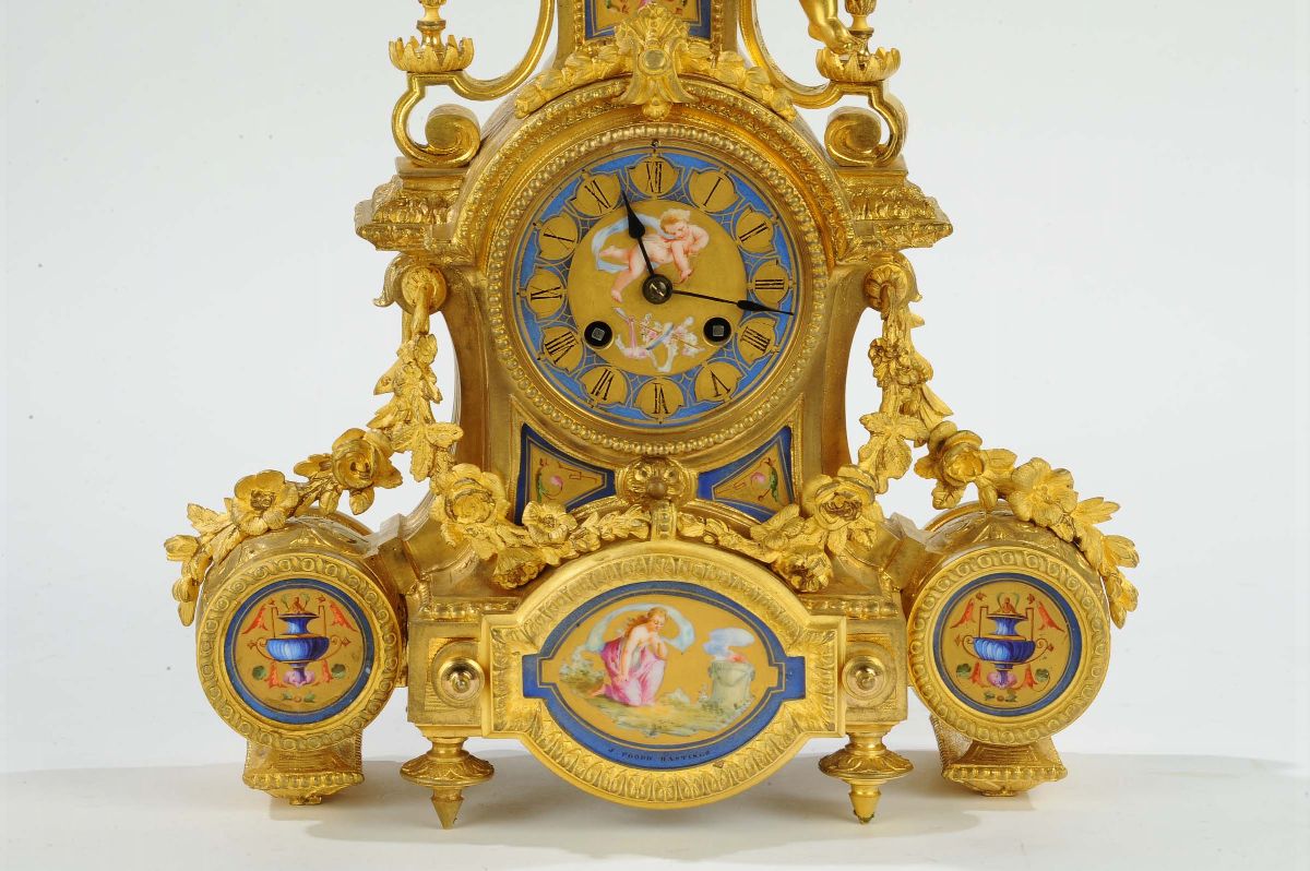 Pendola in bronzo dorato con formelle in porcellana di Sevres, Francia seconda metà del XIX secolo