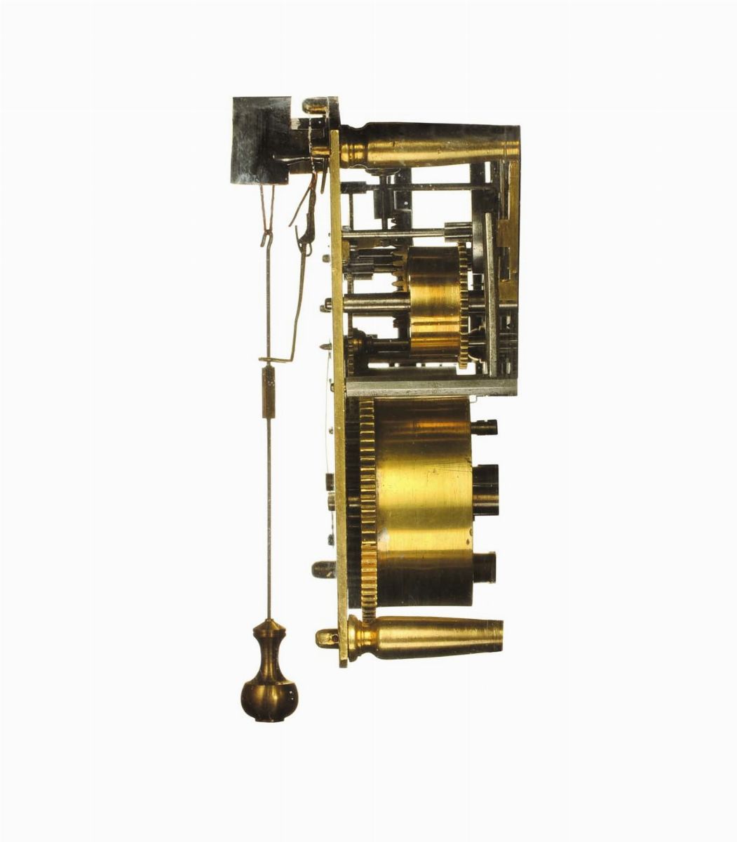 mostra su fondo di velluto con quadrante argentato a fascia oraria con fregi ai lati, disco centrale per puntamento sveglia. Movimento con scappamento a verga, suoneria all’italiana ore/quarti al passaggio su campanelli, sveglia, cm 47x27x19 (lievi difetti)