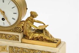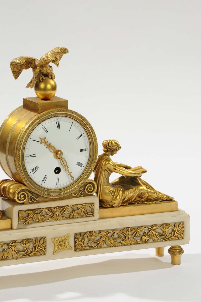 la struttura è sorretta da quattro piedini godronati. Ai lati della meccanica, due fanciulle sono ritratte intente nella loro lettura, mentre sulla sommità della cassa, un'aquila spiega le ali.Quadrante in smalto bianco recante le ore dipinte con numeri romani, mentre due lancette in ottone a fantasia indicano il tempo.Meccanica solo tempo a conoide con scappamento ad ancora e sospensione a lamella, carica settimanale, 35,5x7x29