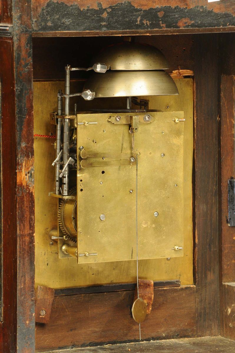 cassa in legno con ricche applicazioni di bronzi dorati, quadrante in bronzo dorato e argentato con numeri romani, meccanica d’epoca non pertinente, scappamento a verga con suoneria a ore e quarti al passaggio con svegliarino, cm 39x22x60 (difetti)