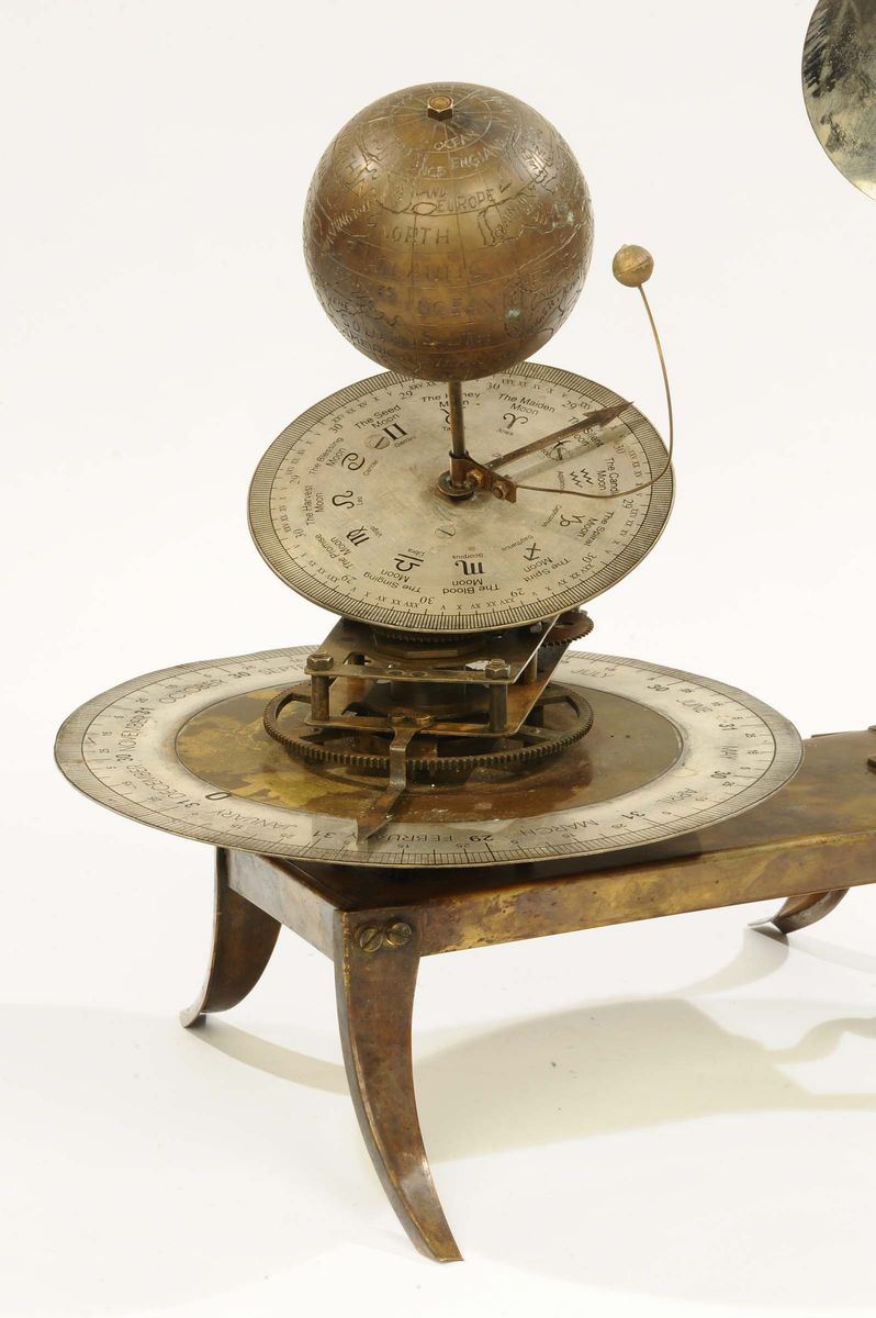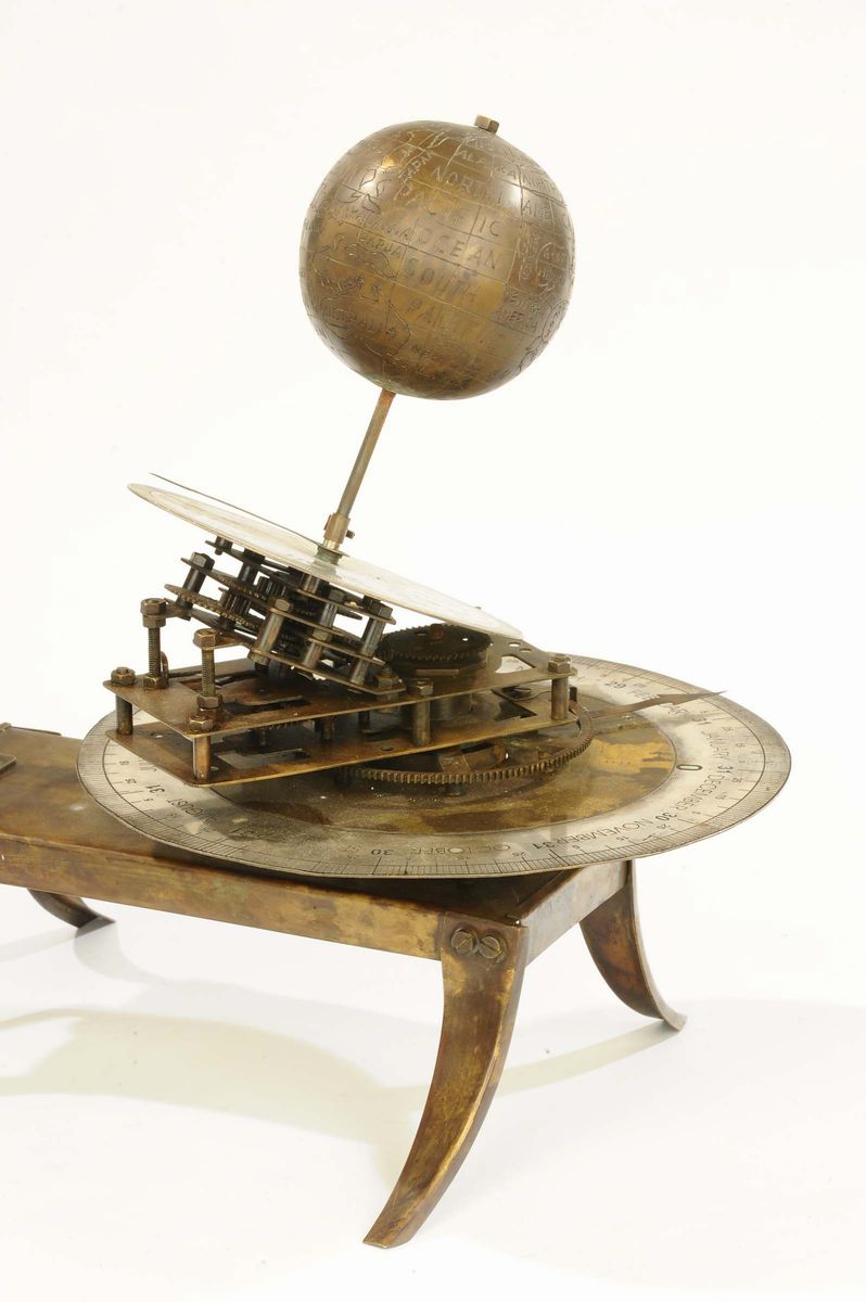 globo terrestre con doppio cerchio di rotazione e luna su braccetto in metallo, specchio con candela a rappresentare il sole, bronzo inciso e argentato, cm 40x26x34