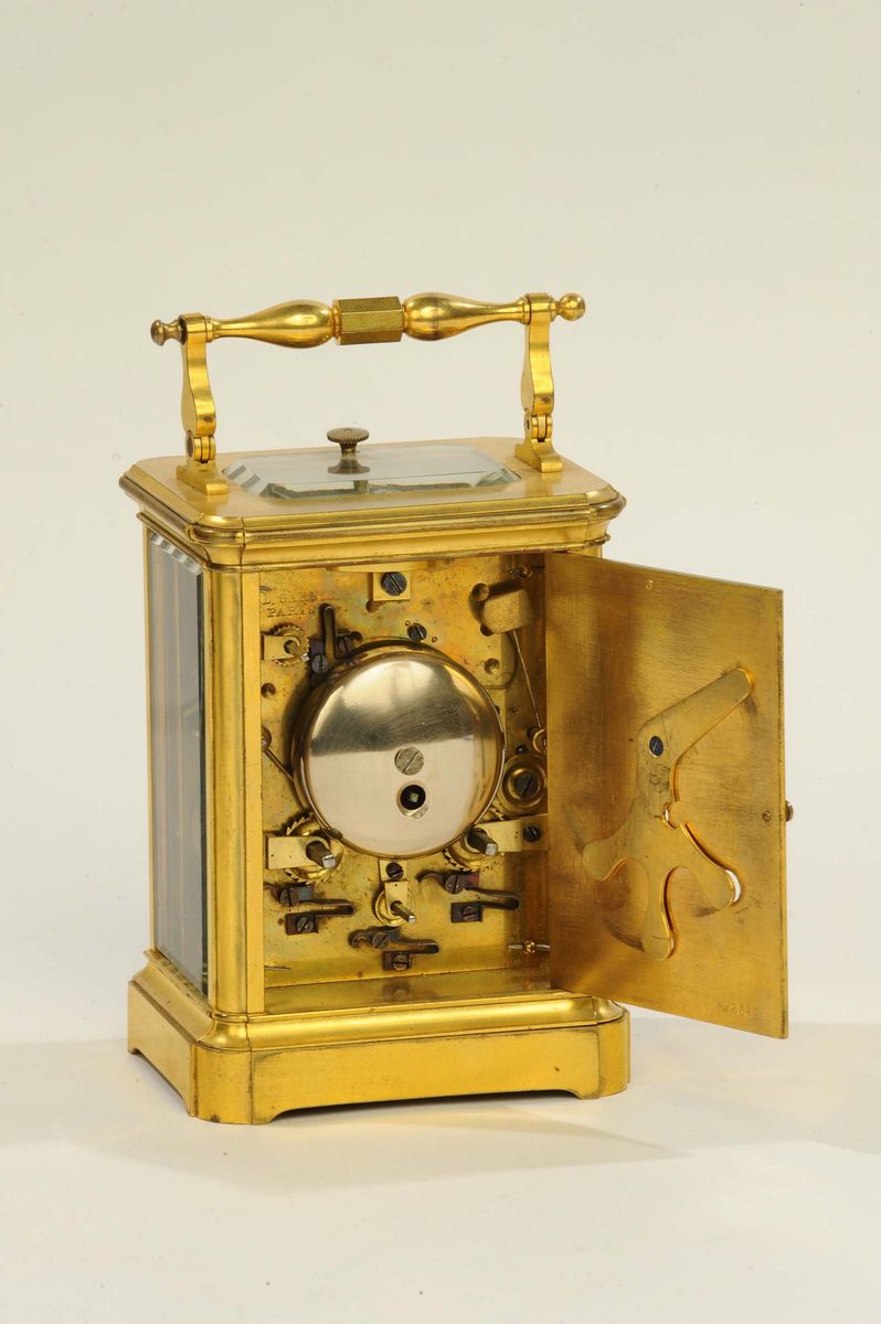 cassa modello Corniche serie III, numero 2836, quadrante bianco con indici blu, piccolo quadrante per la sveglia, lancette a trifoglio. Movimento con scappamento dublex brevettato, suoneria ore/mezze al passaggio e al richiamo su campanello, sveglia. Porta posteriore con fori a scomparsa per carica e regolazione dell’ora e della sveglia, cm 13x9,5x7,5