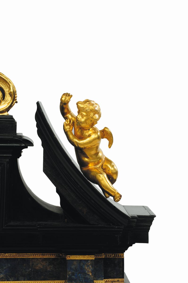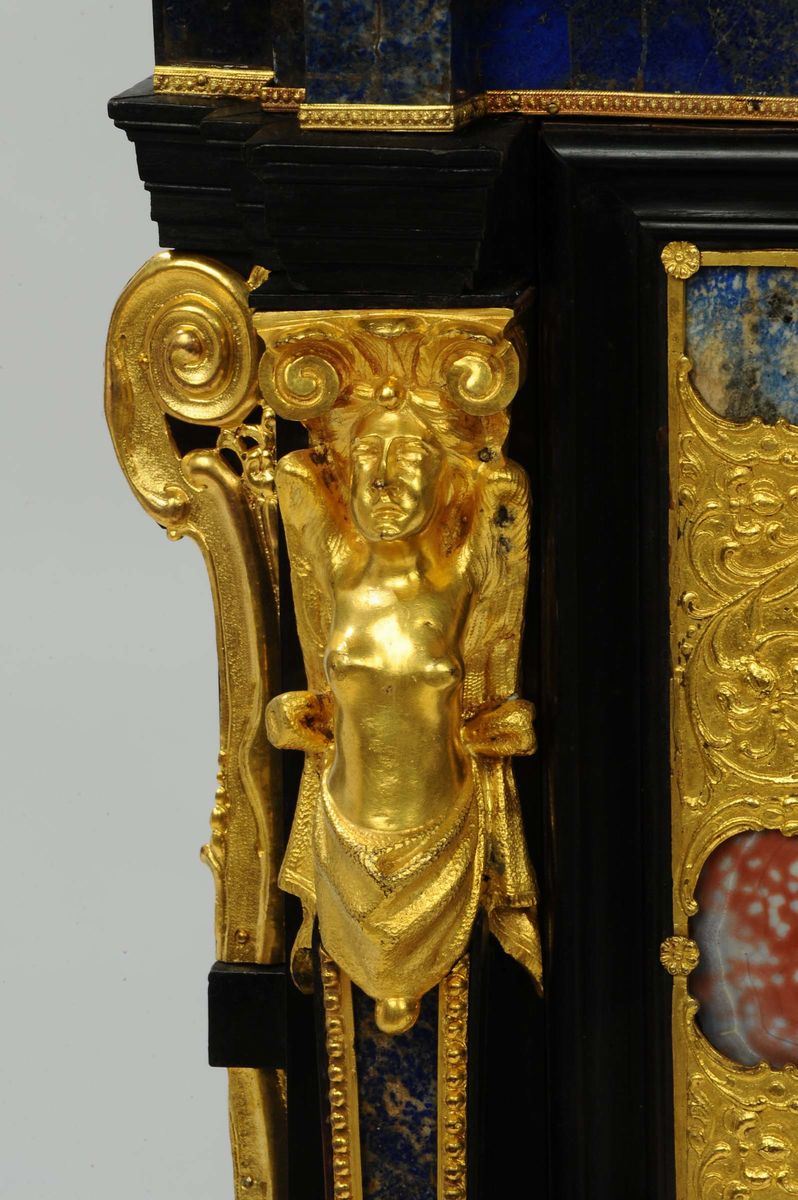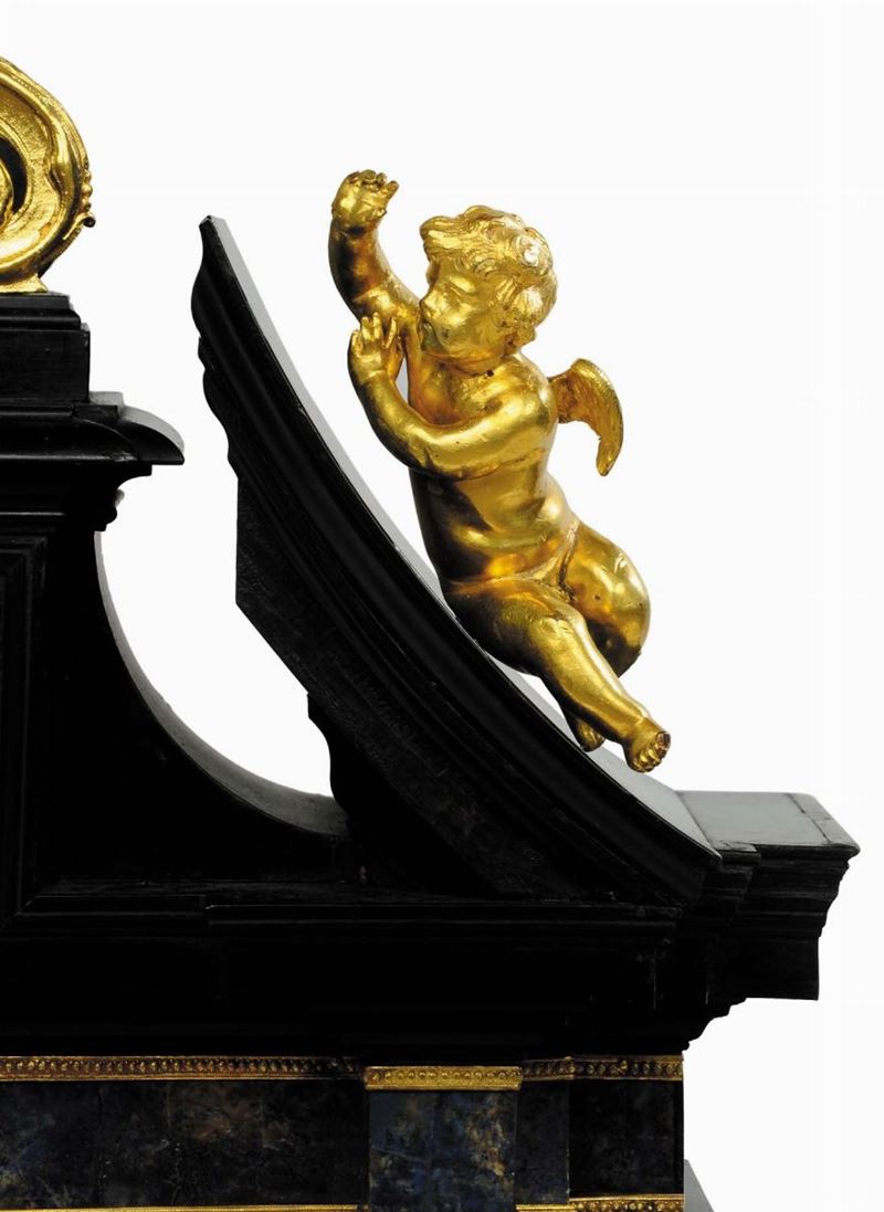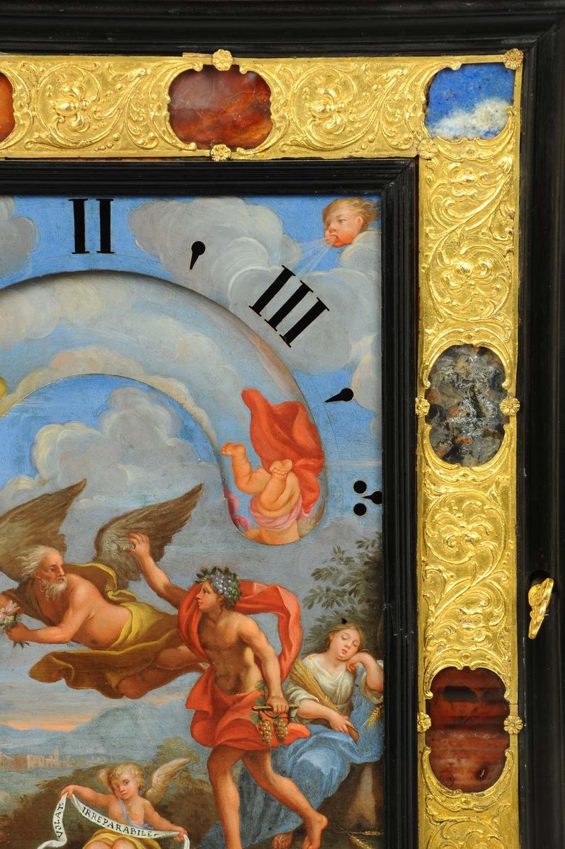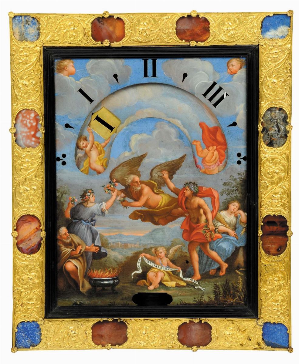 Stima su richiestaQuadrante rettangolare intarsiato con dipinto raffigurante le quattro età dell’uomo; quarti traforati; apertura intagliata per dischi girevoli con le ore del giorno all’interno di una cornice fogliata ornata di vari esemplari di pietre, inclusi lapislazzuli, quarzo, ametista, agata e diaspro di Sicilia; cassa in stile architettonico con frontone aperto centrale e copertura a volta sormontata da una figura di Minerva con putti sui due lati; pannelli incastonati di perline; vetro centrale con dipinto raffigurante il segno dello Zodiaco fiancheggiato da cherubini alati, sorretto da cariatidi e volute; piedistallo anch’esso incastonato in pannello di pietre dure con cassetto centrale; base sporgente montante a più livelli; movimento all’interno della cassa protetto da occhielli in ottone, grande bariletto a molla con frontale aperto intagliato da dietro recante l’iscrizione Petrus Thomas Campanus Inventor Romae 1682; scappamento a manovella silenzioso con pendolo corto; dipinto a olio su rame; suddivisioni delle ore illuminati da una piccola lanterna a olio posta sul pannello originale della cassa; caminetto originale per la fuoriuscita del fumo sul retro della cassa. La storia dell’invenzione dell’orologio notturno ci offre un episodio intrigante riguardante la sua ideazione, Papa Alessandro VII (1655-1667), che soffriva d’insonnia e mal sopportava il ticchettio dell’orologio della sua stanza da letto, commissionò ai fratelli Campani la realizzazione di un orologio silenzioso e leggibile anche nel cuore della notte grazie alla realizzazione di un quadrante traforato che veniva illuminato posteriormente da una piccola lucerna a olio oppure da una candela. Completato un primo prototipo nel 1656, Pietro Tommaso Campani, accompagnato dai suoi fratelli lo portarono dal Papa Alessandro VII per mostrarglielo, il Papa fu così contento dell’invenzione che rilasciò un brevetto pontifico in nome di Pietro Tommaso Campani. Generalmente i brevetti del Papa erano rilasciati a protezione di monopoli e nuovi procedimenti, raramente per invenzioni. I Campani si ritrovarono improvvisamente non solo famosi, ma anche oberati di lavoro per i numerosi ordini provenienti da importanti committenti quali: principi, nobili, ambasciatori ed esponenti dell’alto clero. La moda degli orologi notturni andò diffondendosi non solo in Italia ma in tutta Europa. Tra i primi illustri clienti dei Campani vi furono il Re di Spagna Filippo IV e la sua Regina, Re Giovanni Casimiro I di Polonia e il Granduca Ferdinando II di Toscana. Questi sontuosi orologi notturni furono realizzati con una struttura a forma di altare, questa scelta nasceva inizialmente dalla necessità di creare uno stile consono all’austero mobilio della camera da letto papale. Si rendeva necessario pertanto che essa fosse conforme all’ambiente religioso, tra l’altro a quei tempi lo stile delle “edicole reliquarie” (un altare domestico o tabernacolo privato in voga a quel tempo), era comune nelle ricche residenze e nei palazzi della nobiltà romana ed era molto ricercato come elemento di arredo. Generalmente era di colore scuro, tenuto conto degli scopi religiosi, realizzato d’ebano oppure con altri legni ebanizzati, in qualche caso, per le realizzazioni più importanti era decorato con inserti policromi di pietra dura. La struttura ad altare culminava con un frontone fiancheggiato da volute e presentava un pannello frontale centrale di rame, spesso dipinto con soggetti d’ispirazione allegorica o religiosa. Quest’ultimo era frequentemente contornato da colonnine decorative o da lesene. Le dimensioni totali delle casse dell’orologio erano determinate dallo spazio necessario ad alloggiare il pannello del quadrante, che, a sua volta, doveva essere sufficientemente grande per essere letto da lontano. Questi lussuosi e sofisticati orologi ad altare si rivolgevano esclusivamente ad una clientela importante ed elitaria ed erano realizzati da una squadra di maestri ebanisti, scultori, bronzisti e pittori. L’orologio firmato da Pietro Tommaso Campani e datato 1683 conservato al British Museum presenta notevoli somiglianze con l’esemplare messo oggi all’incanto, sia nella forma, sia nella decorazione; la sontuosità di quest’orologio notturno suggerisce di attribuire quasi certamente la cassa a Giacomo Hermann, ebanista tedesco attivo a Roma. È ormai appurato che Giacomo Hermann collaborò per molti anni con i fratelli Campani. Infatti, un altro imponente orologio notturno sempre firmato Pietro Tommaso Campani e datato 1663 fa parte delle collezioni di arredi dello studiolo del Kunsthistorisches Museum di Vienna, realizzati da Giacomo Hermann a Roma poco prima della sua morte, avvenuta nel 1685. Il pannello frontale del presente orologio è stato realizzato in rame dipinto a olio ed è senza dubbio opera di Carlo Maratta, uno dei pittori di maggior successo della Roma del tardo XVII secolo, per riferimento si veda il quadrante dipinto dell’orologio di Pietro Tommaso Campani conservato presso il British Museum di Londra.Petrus Thomas Campanus Inventor Romae 1682 An Italian night clock of museum quality, Pietro Tommaso Campani, Carlo Maratta, Giacomo Hermann (attr.), late 17th century.The case of this amazing Italian night clock was designed in the style of a late 17th century altar. As with most clocks of this kind, its ebony case is decorated with a painted copper plate flanked by columns; it also has a pediment. The “altar style” was very popular in Italy at the time where altars were - as the name indicates - taken as inspiration for architectural designs. Altar clocks made in Rome were the most famous of the kind. A team of craftsmen created these most complicated and richly decorated altar clocks: watchmakers, case makers, sculptors, bronzers and painters. The elaborate baroque decoration and the ample use of “pietra dura” for this clock indicate that Jakob Hermann, a German cabinetmak