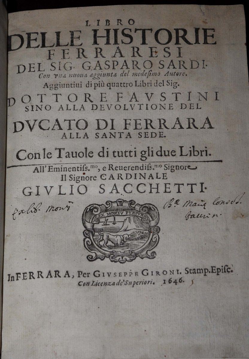 Libro delle Historie ferraresi. In Ferrara, per Giuseppe Gironi, Stamp. Episc., 1646.