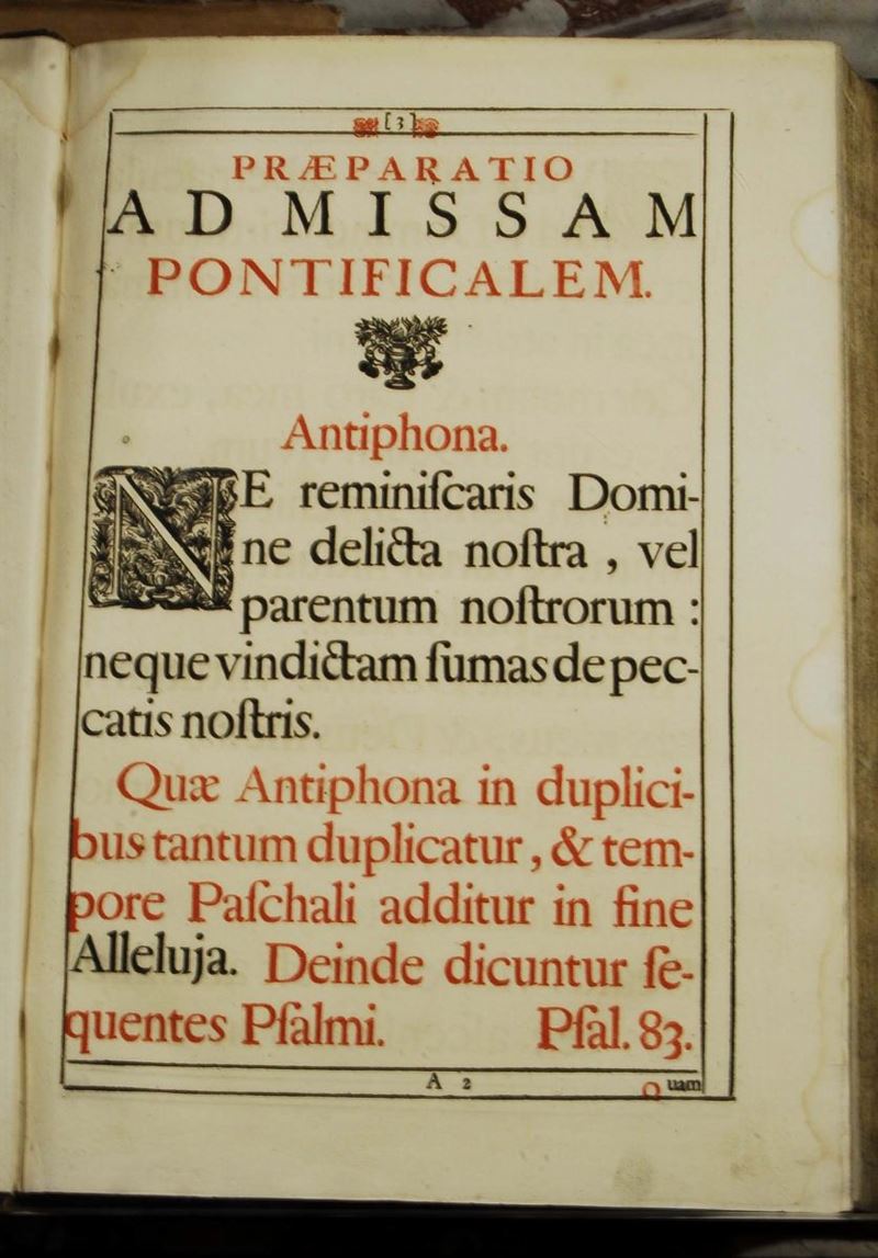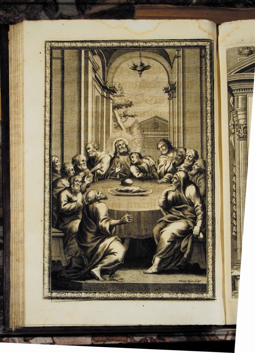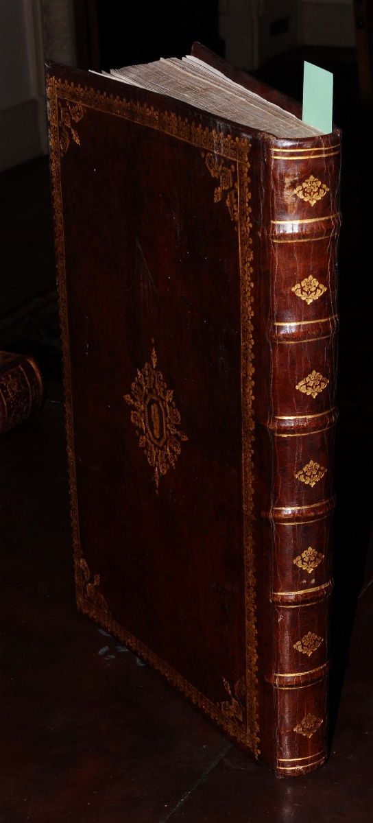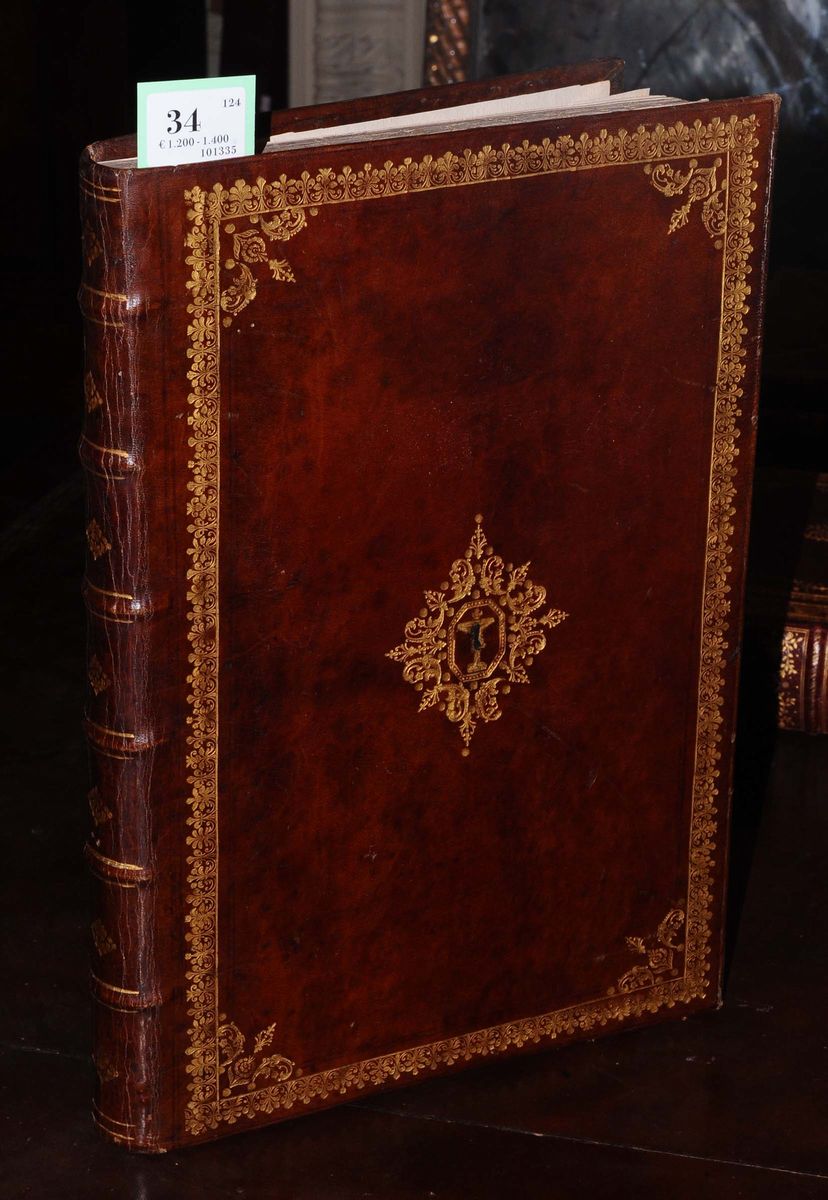 In-folio, ottima legatura in pieno marocchino porpora, piatti inquadrati da bordura e fregi accantonati, croce al naturale incisa in oro al centro dei piatti. Tagli dorati e cesellati. Magnifico esemplare, sontuosamente illustrato.