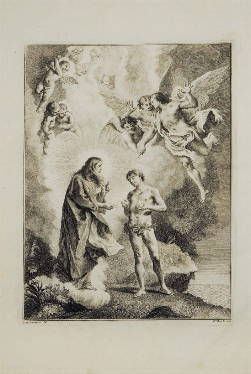 In-folio, bella legatura coeva in piena pelle marezzata, dorso a 6 nervi con fregi in oro, piatti inquadrati da duplice ordine di filetti in oro, tagli a spruzzo. Antip. e vignette calcogr. incise da Francesco Zucchi su disegni di Piazzetta, Mella Vero, Picart, Piati, Casteau, Zignaroli, Brida, Tiepolo, Bilij, Bigeri. Ottimo esemplare, freschissimo e marginoso, impresso su carta forte.