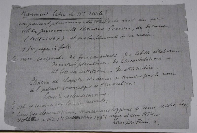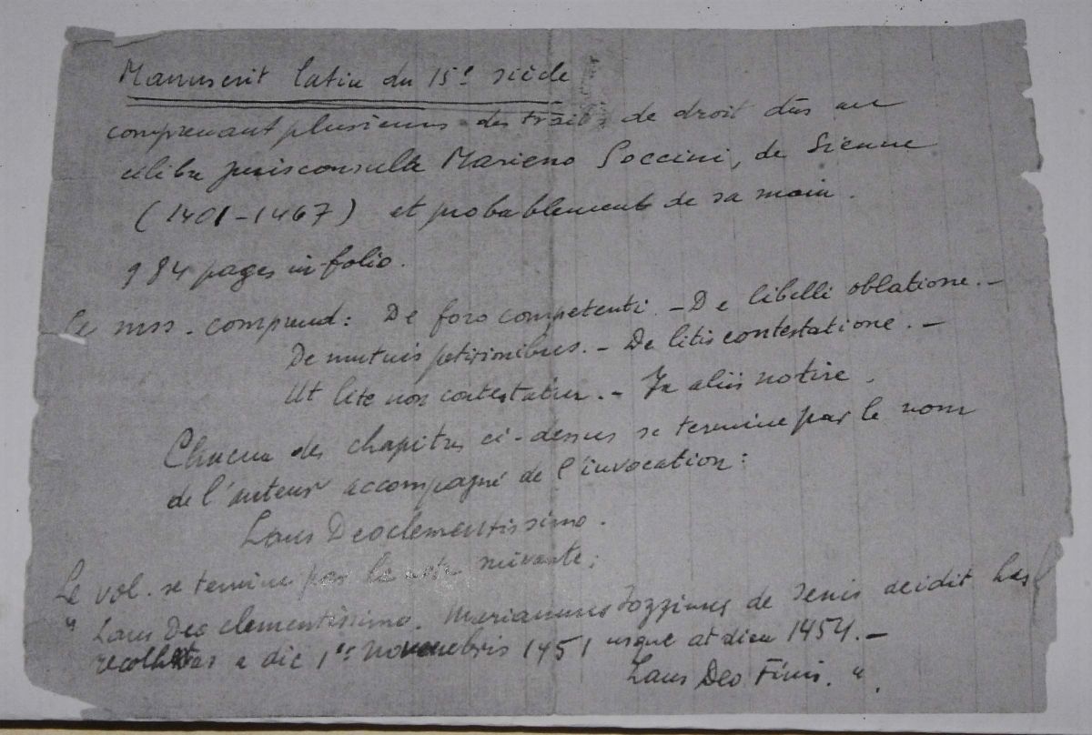 Manoscritto cartaceo quattrocentesco che contiene diversi trattati di argomento giuridico del giureconsulto senese Mariano Soccini. Il testo consta di 492 carte numerate a penna ed è probabilmente copia autografa dello stesso Soccini. Si desume da elementi testuali che venne compilato tra il 1451 e 1454. Conservato in una legatura coeva con piatti in legno. Dorso mancante, fermagli assenti.