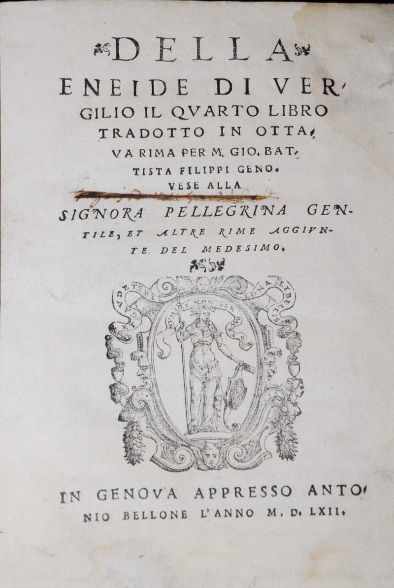Della Eneide di Vergilio il quarto libro tradotto in ottava rima per M. Gio. Battista Filippi Genouese alla Signora Pellegrina Gentile, et altre rime aggiunte del medesimo. In Genova, appresso Antonio Bellone, 1562. In-4, legatura in piena perg. moderna con tassello recante titolo in oro. Lievi gore. VIRGILIO Publio Marone, L'eneide di Parigi, In Parigi : presso la vedova Quillau, 1760. 2 voll. in-8. Belle legature in piena pelle marezzata con dorso a nervi e scomparti decorati in oro, piatti inquadrati da duplice filetto in oro. Tagli macchiettati di verde e di azzurro. Incisioni su disegni di Giuseppe Zocchi.