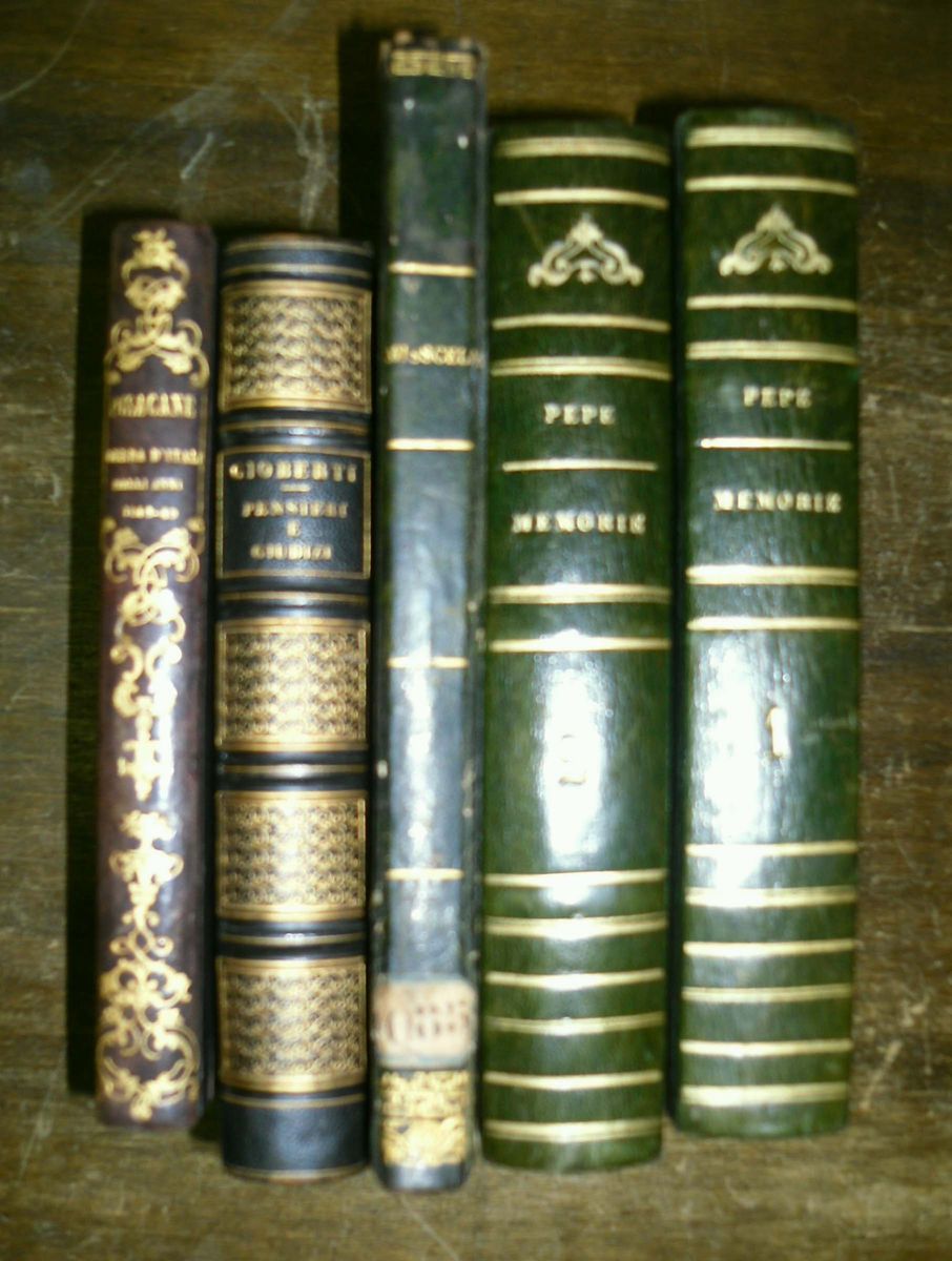 PEPE Guglielmo, Memorie del Generale Guglielmo Pepe intorno alla sua vita e ai recenti casi d'Italia. Scritte da lui medesimo. Edizione riveduta ed emendata. Volume primo (-secondo), Lugano Tipografia della Svizzera italiana, 1847. 2 voll. in-8, legatura in mezza pelle verde con fregi e titolo in oro al dorso. Si uniscono al lotto una miscellanea di scritti risorgimentali, la narrazione della guerra del 1848-1849 del Pisacane e i pensieri intorno alla letteratura italiana di Gioberti.