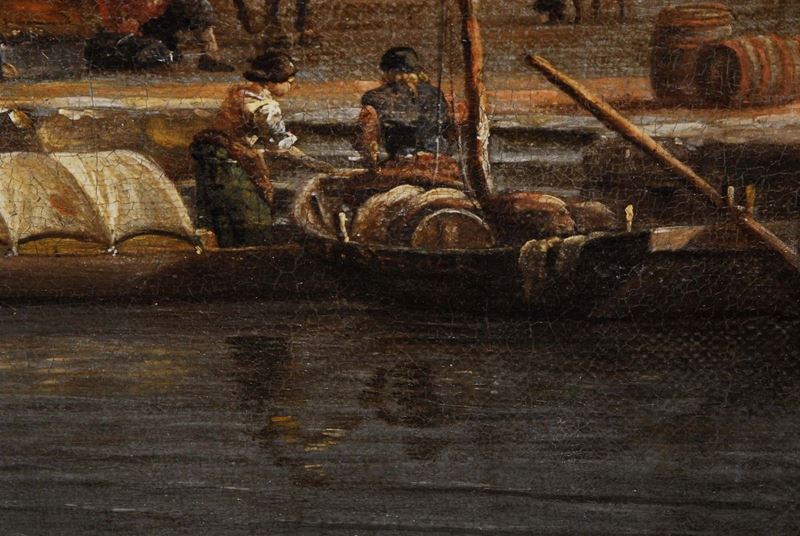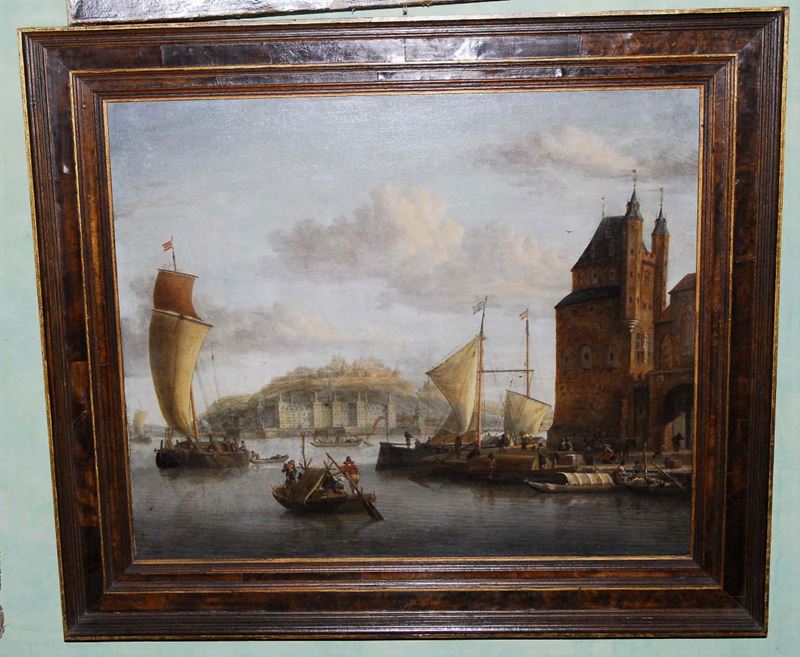 Abraham Storck (1644-1708) Castello di Elsinore dal porto con figure
