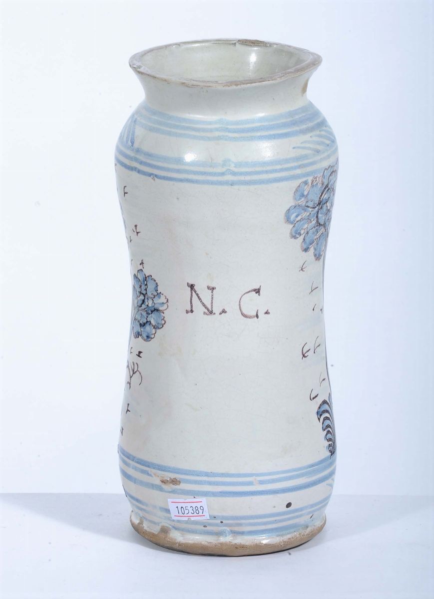 Albarello in maiolica , siglato N.C., La Terza XVII secolo
