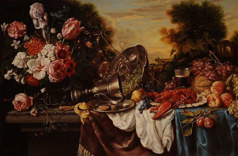 Grande Natura Morta con aragosta e fiori