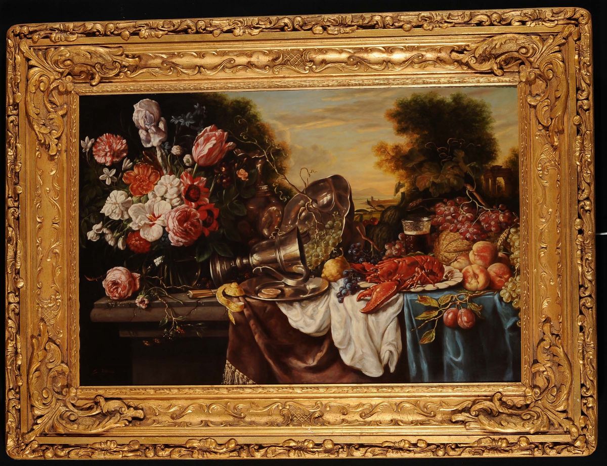 Anonimo del XIX secolo Grande Natura Morta con aragosta e fiori