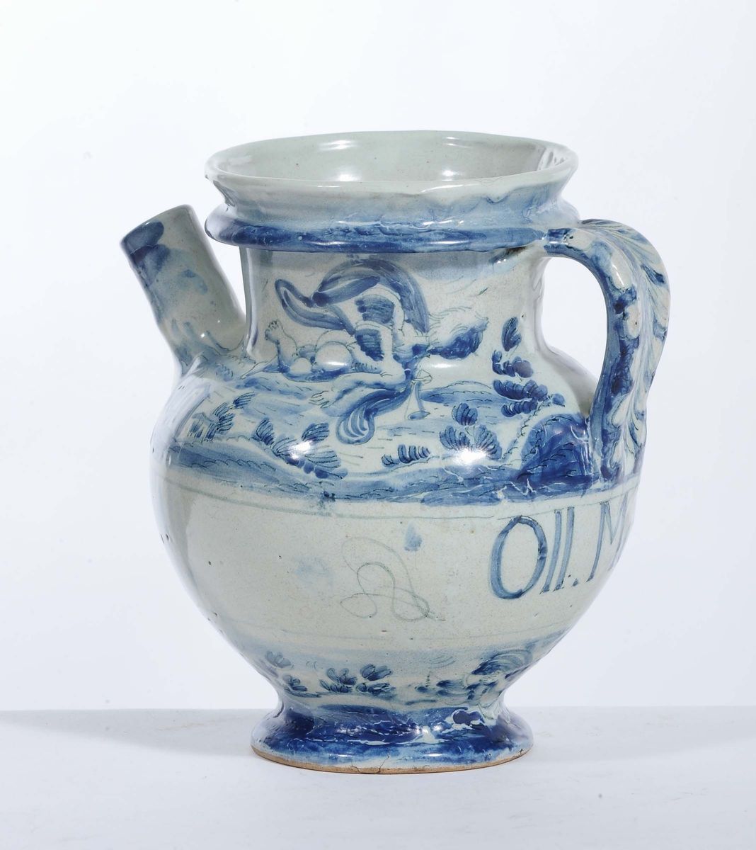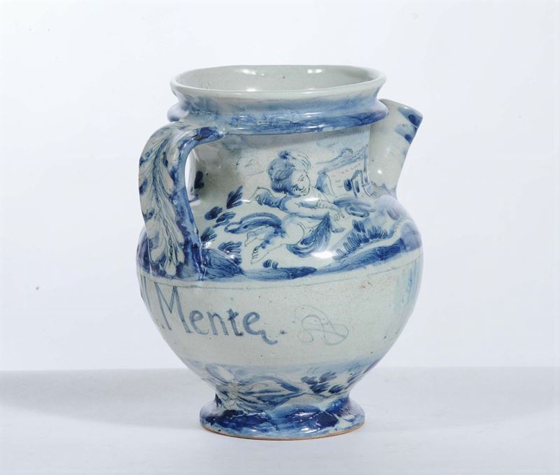 decoro blu su fondo bianco raffigurante putti, altezza cm 19