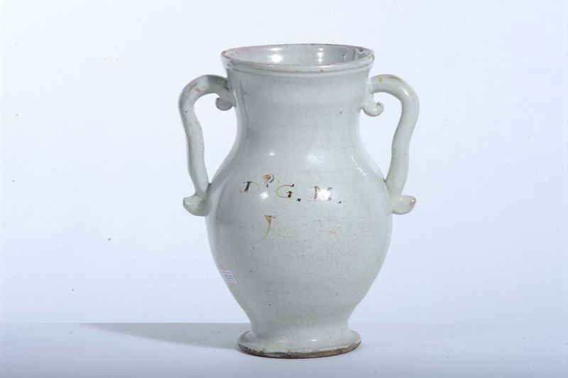 Brocca in maiolica con manici, siglata D.G.M., XVIII secolo